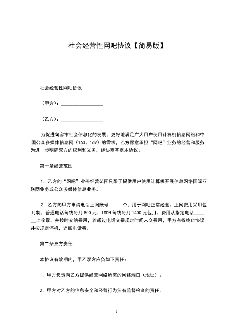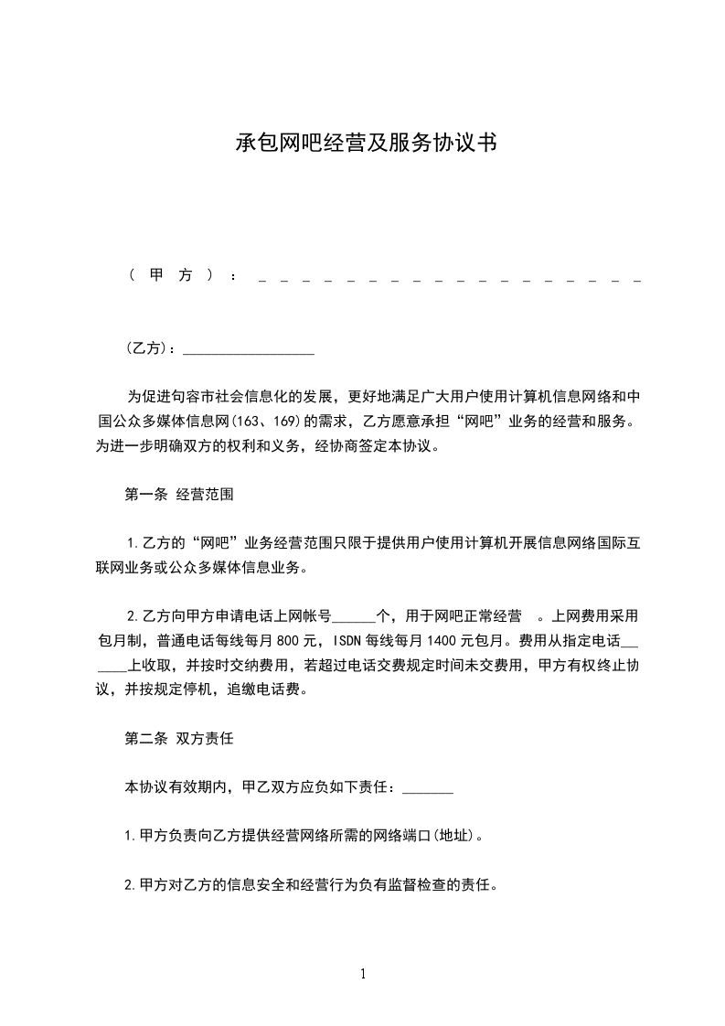 甲乙双方就乙方承包甲方 网吧一事经协商达成如下协议: