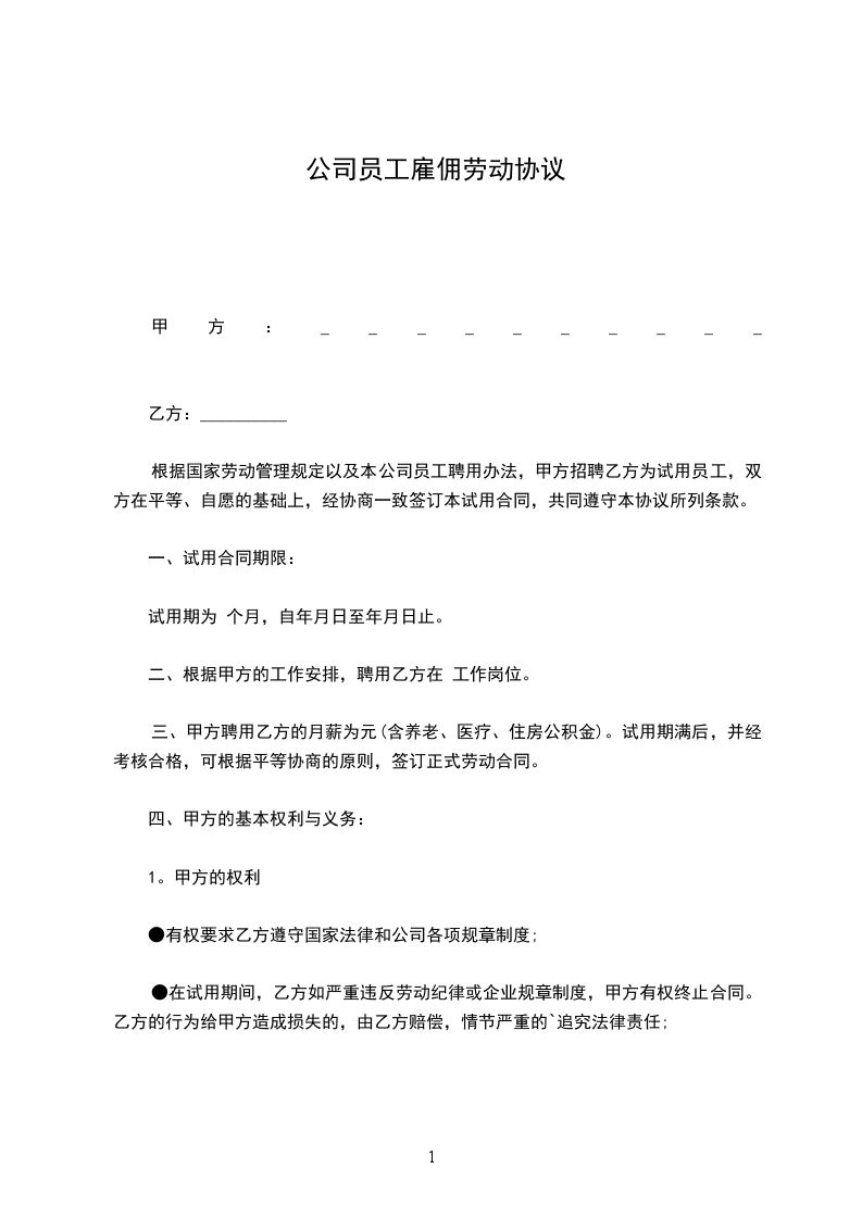 根据国家劳动管理规定以及本公司员工聘用办法,甲方招聘乙方为试用员工,双方在平等、自愿的基础上,经协商一致签订本试用合同,共同遵守本协议所列条款。