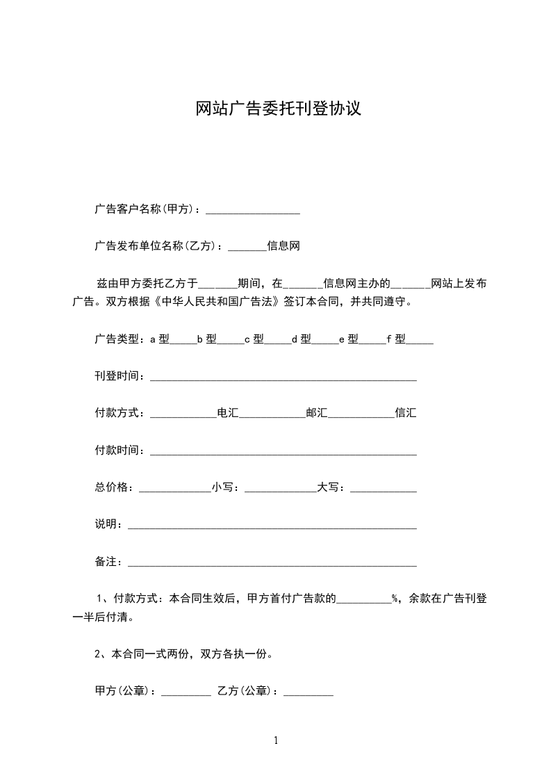 1、价格和折扣甲方在乙方网站广告投放时间_____年_____月_____日至_____年_____月_____日网站首面横幅:投放时间_____年_____月_____日至_____年_____月_____日价格为:元/周__10天共计:元