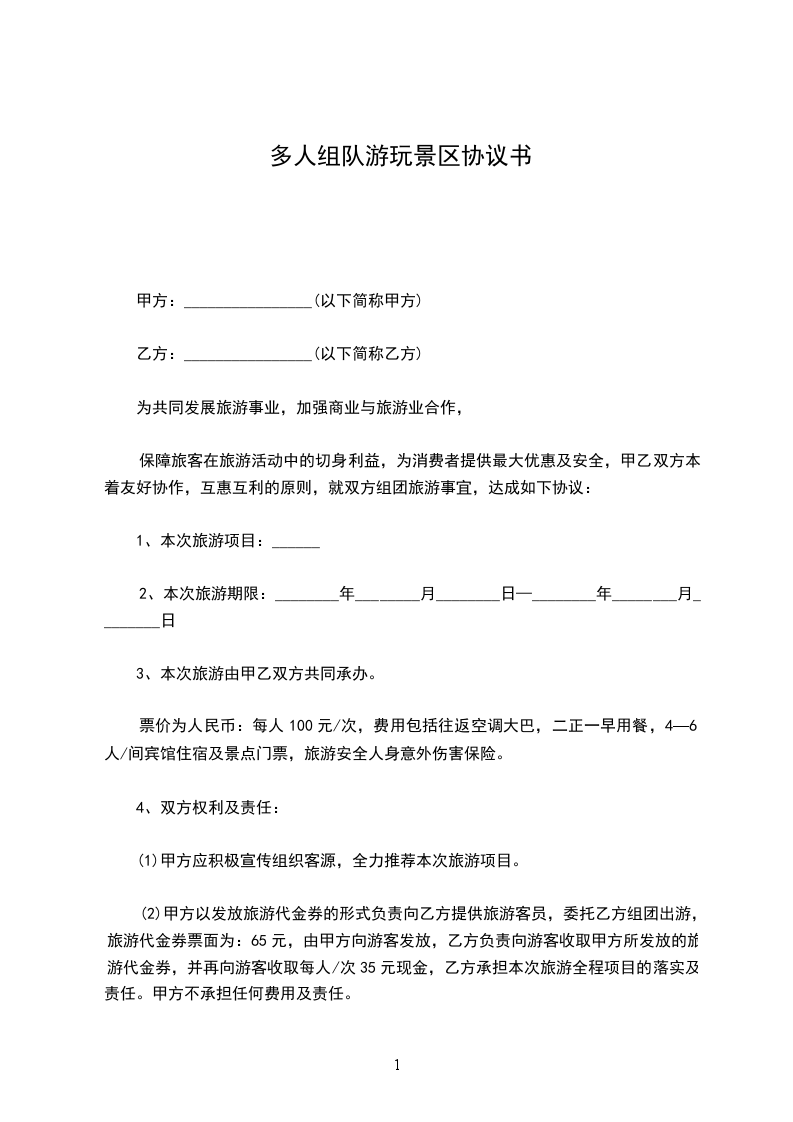 (2)甲方以发放旅游代金券的形式负责向乙方提供旅游客员,委托乙方组团出游,旅游代金券票面为:65元,由甲方向游客发放,乙方负责向游客收取甲方所发放的旅游代金券,并再向游客收取每人/次35元现金,乙方承担本次旅游全程项目的落实及责任。甲方不承担任何费用及责任。