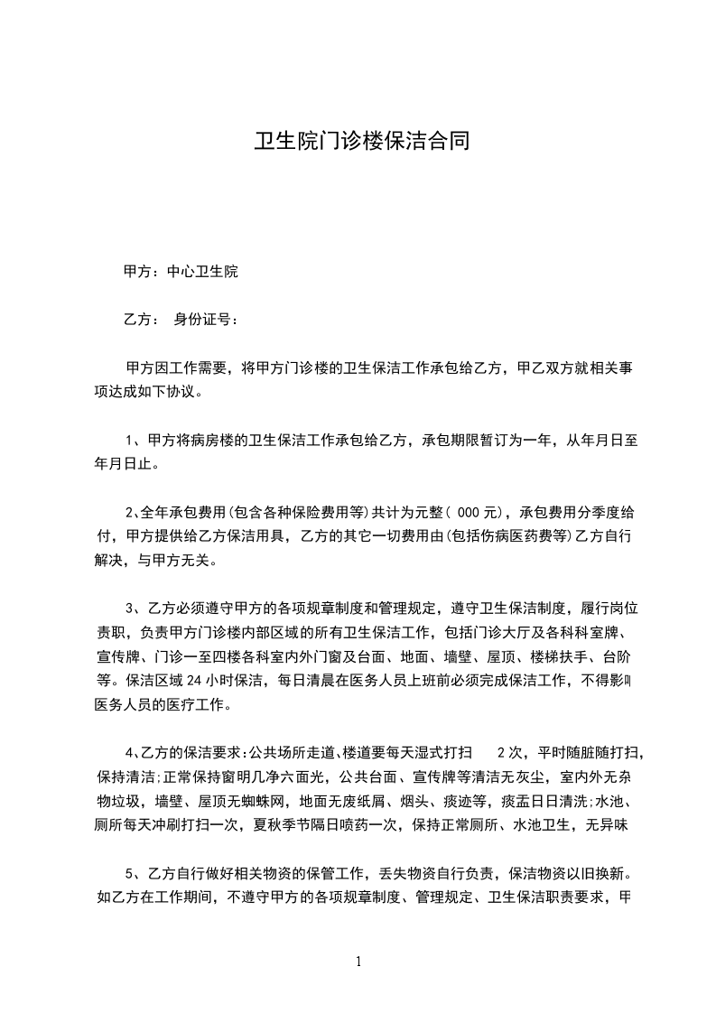 1、甲方将病房楼的卫生保洁工作承包给乙方,承包期限暂订为一年,从_____年_____月_____日至_____年_____月_____日止。