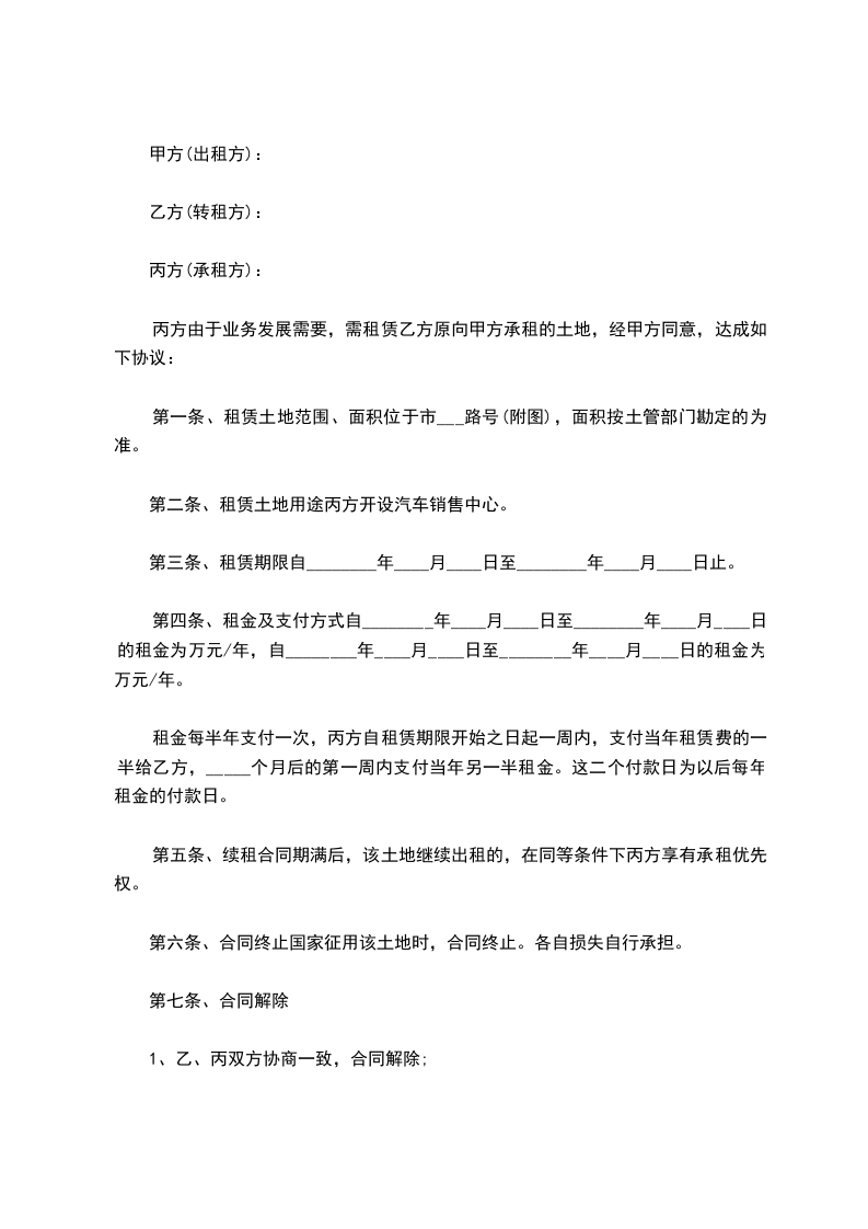 丙方由于业务发展需要,需租赁乙方原向甲方承租的土地,经甲方同意,达成如下协议:
