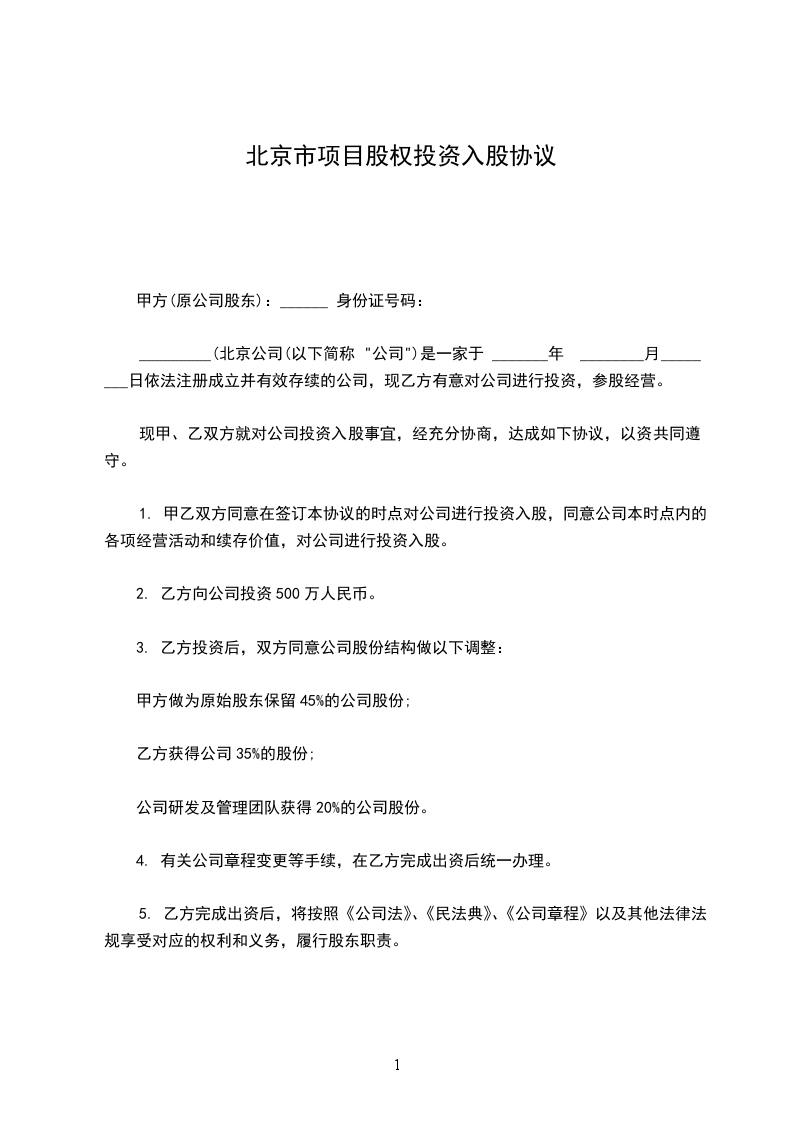 1. 甲乙双方同意在签订本协议的时点对公司进行投资入股,同意公司本时点内的各项经营活动和续存价值,对公司进行投资入股。