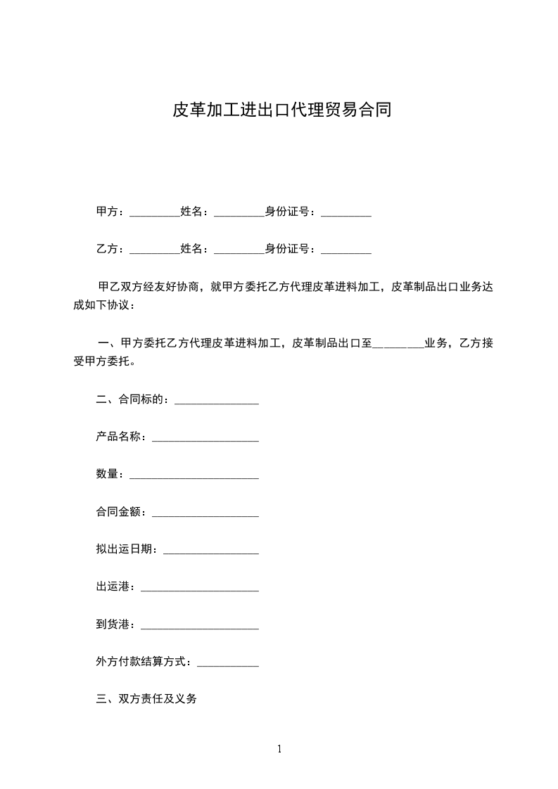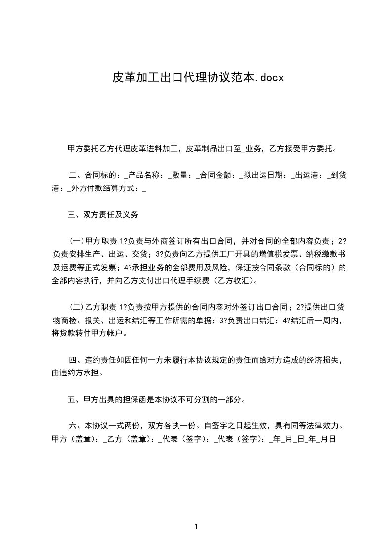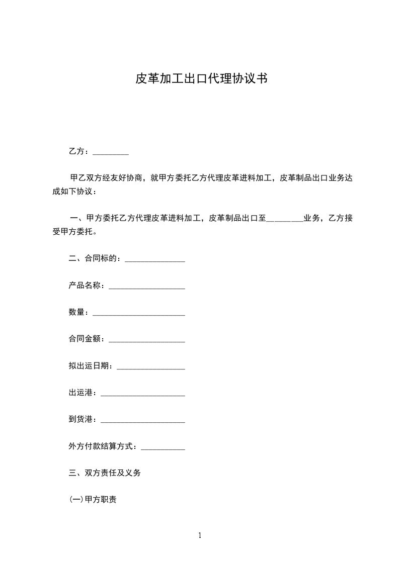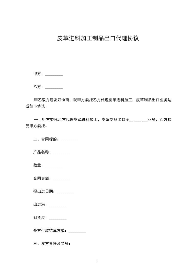 一、甲方委托乙方代理皮革进料加工,皮革制品出口至_________业务,乙方接受甲方委托。