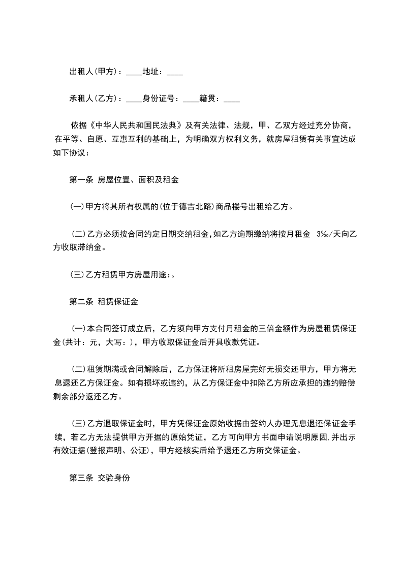 (一)甲方将其所有权属的(位于德吉北路)商品楼号出租给乙方。