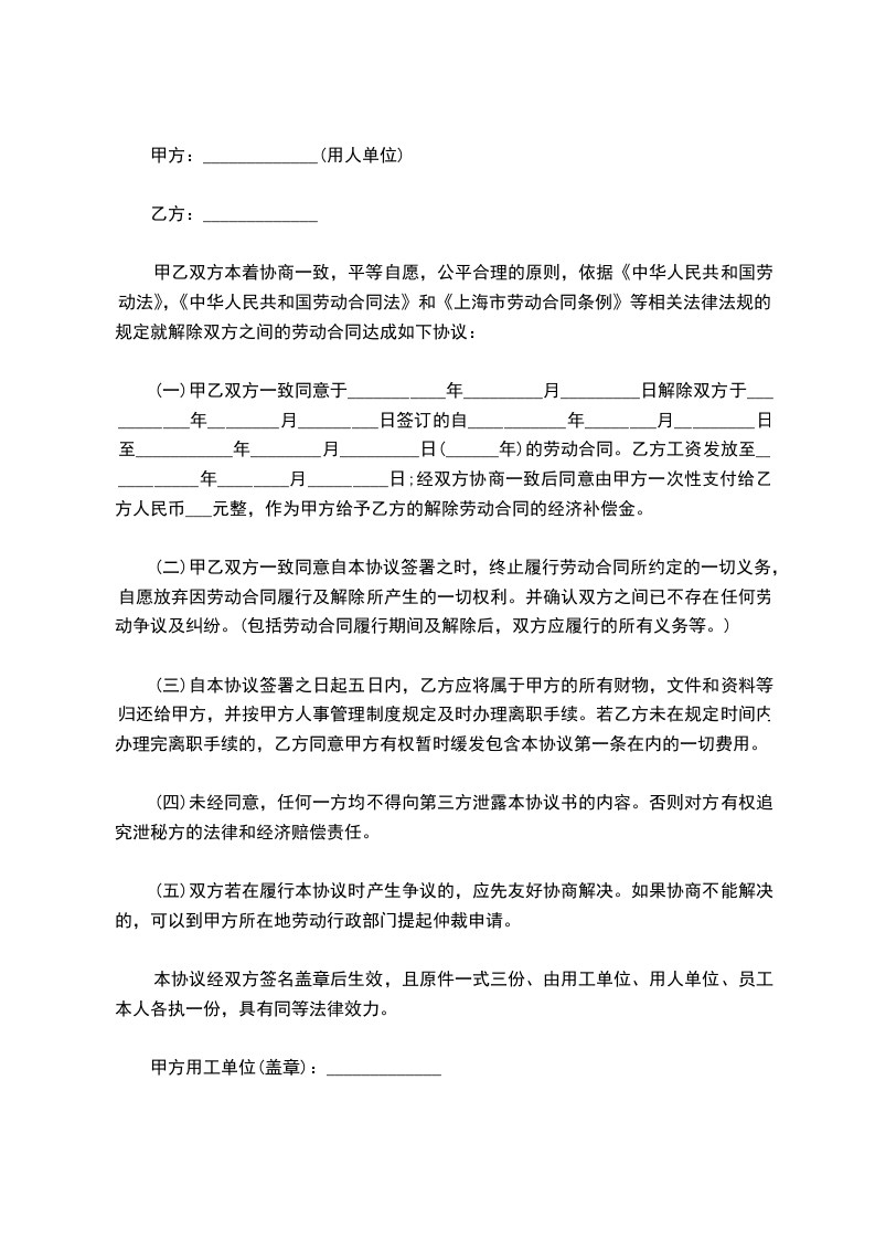 甲乙双方本着协商一致,平等自愿,公平合理的原则,依据《中华人民共和国劳动法》,《中华人民共和国劳动合同法》和《上海市劳动合同条例》等相关法律法规的规定就解除双方之间的劳动合同达成如下协议: