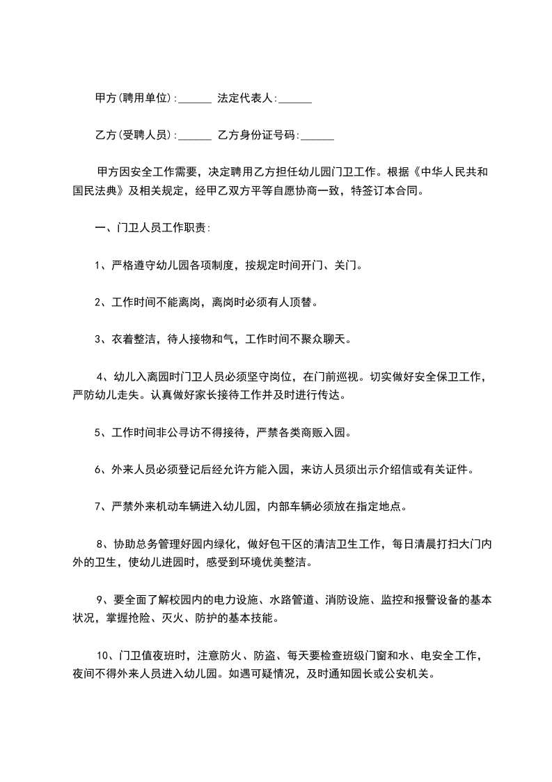 甲方因安全工作需要,决定聘用乙方担任幼儿园门卫工作。根据《中华人民共和国民法典》及相关规定,经甲乙双方平等自愿协商一致,特签订本合同。
