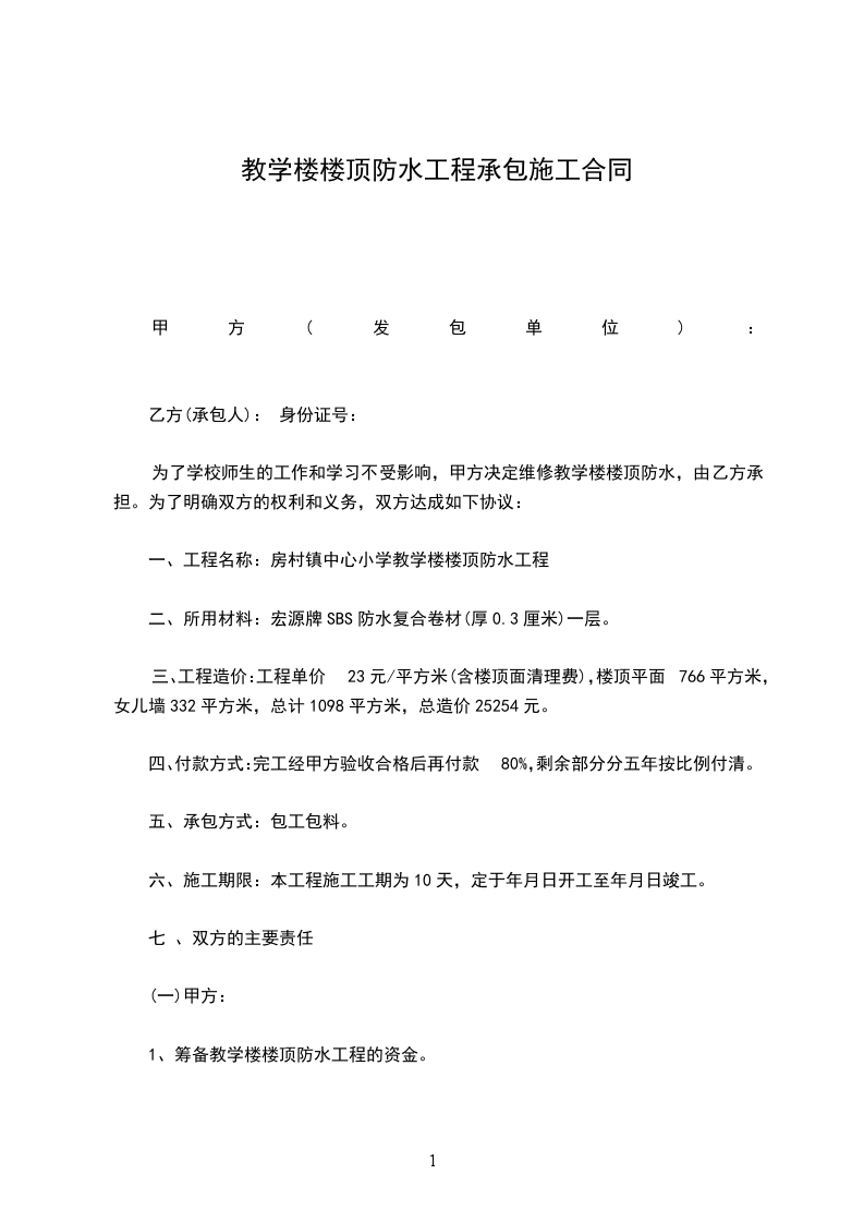 一、工程名称:房村镇中心小学教学楼楼顶防水工程