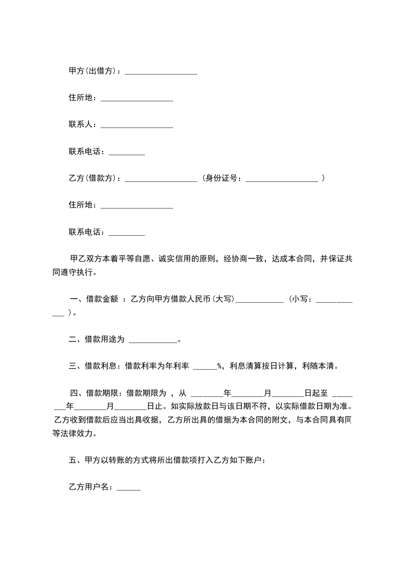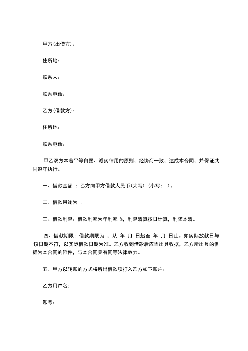 一、借款金额 :乙方向甲方借款人民币(大写) (小写: )。