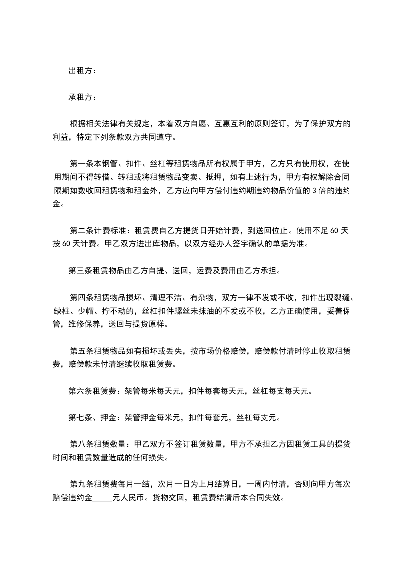 第六条租赁费:架管每米每天元,扣件每套每天元,丝杠每支每天元。