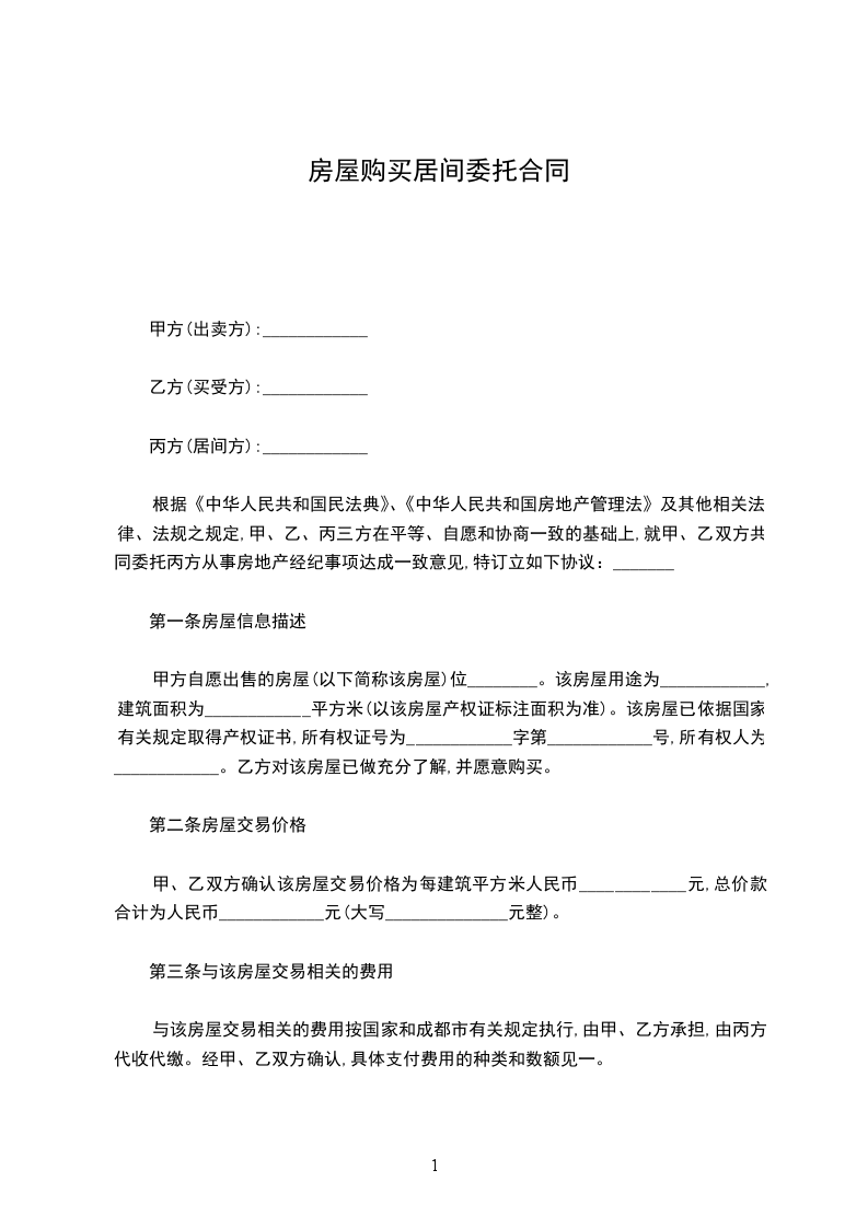 一、委托方______家住____________因居住需要,需购买___地区房地产,为便于联系,由______为代表前来签约,要求居间方提供能与出售房地产方订约交易的机会。