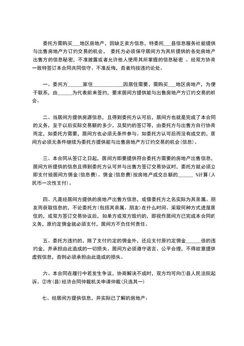 委托方需购买___地区房地产,因缺乏卖方信息,特委托___县信息服务社能提供与出售房地产方订约交易的机会, 委托方必须保守居间方为其所提供的各处房地产出售方的信息秘密,不准披露或者允许他人使用其所掌握的信息秘密 。经双方协商一致特签订本合同共同信守、不准反悔,否者均按违约论处。