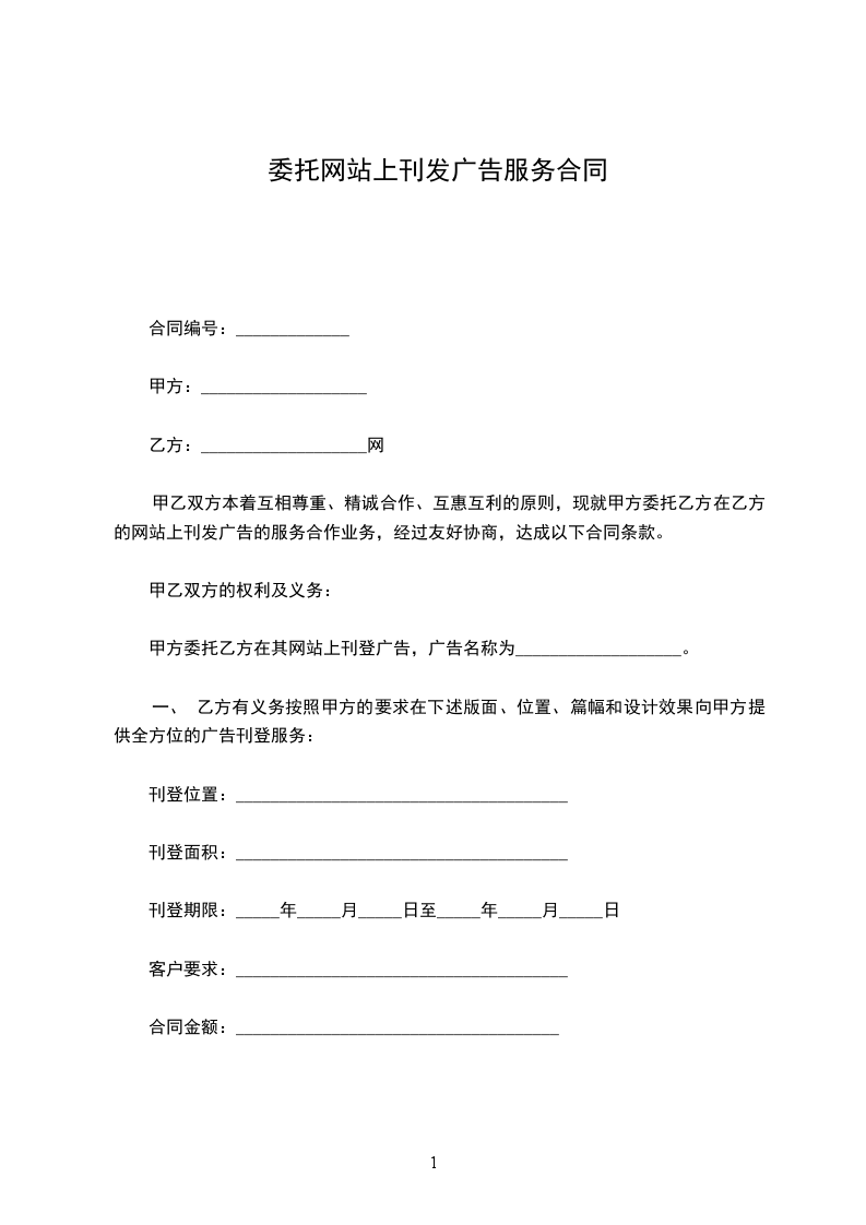甲乙双方本着互相尊重、精诚合作、互惠互利的原则,现就甲方委托乙方在乙方的网站上刊发广告的服务合作业务,经过友好协商,达成以下合同条款。