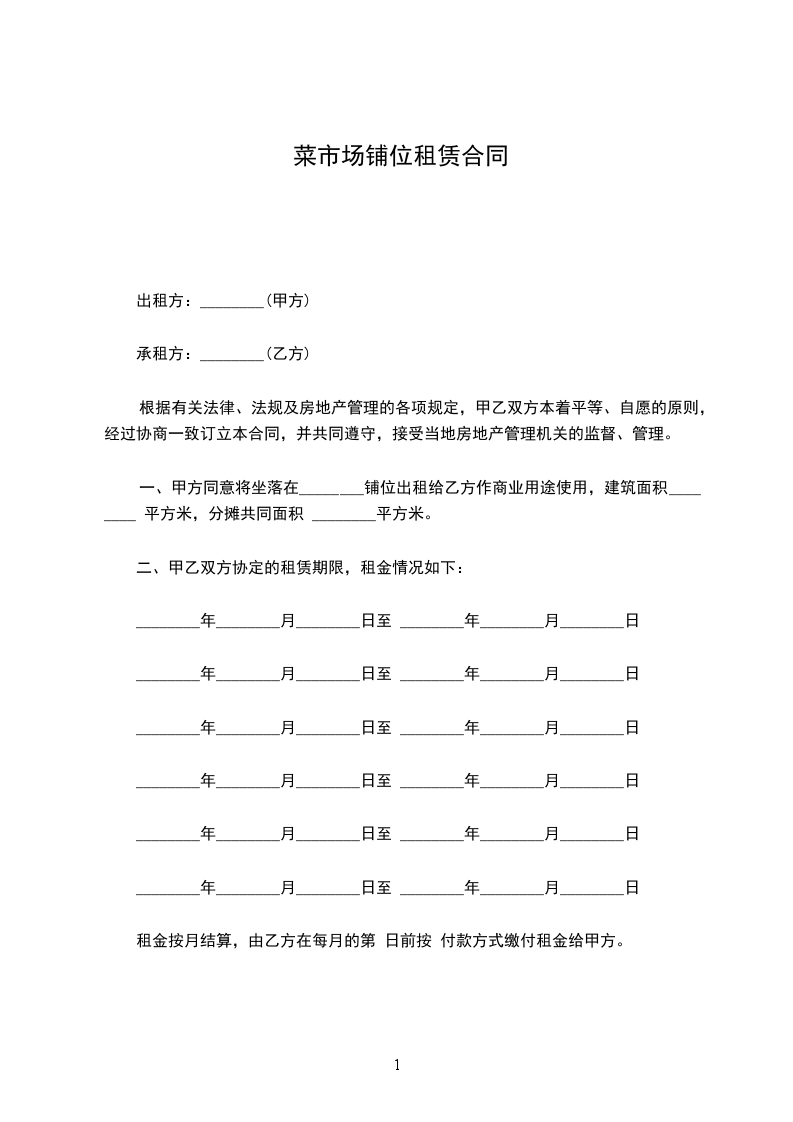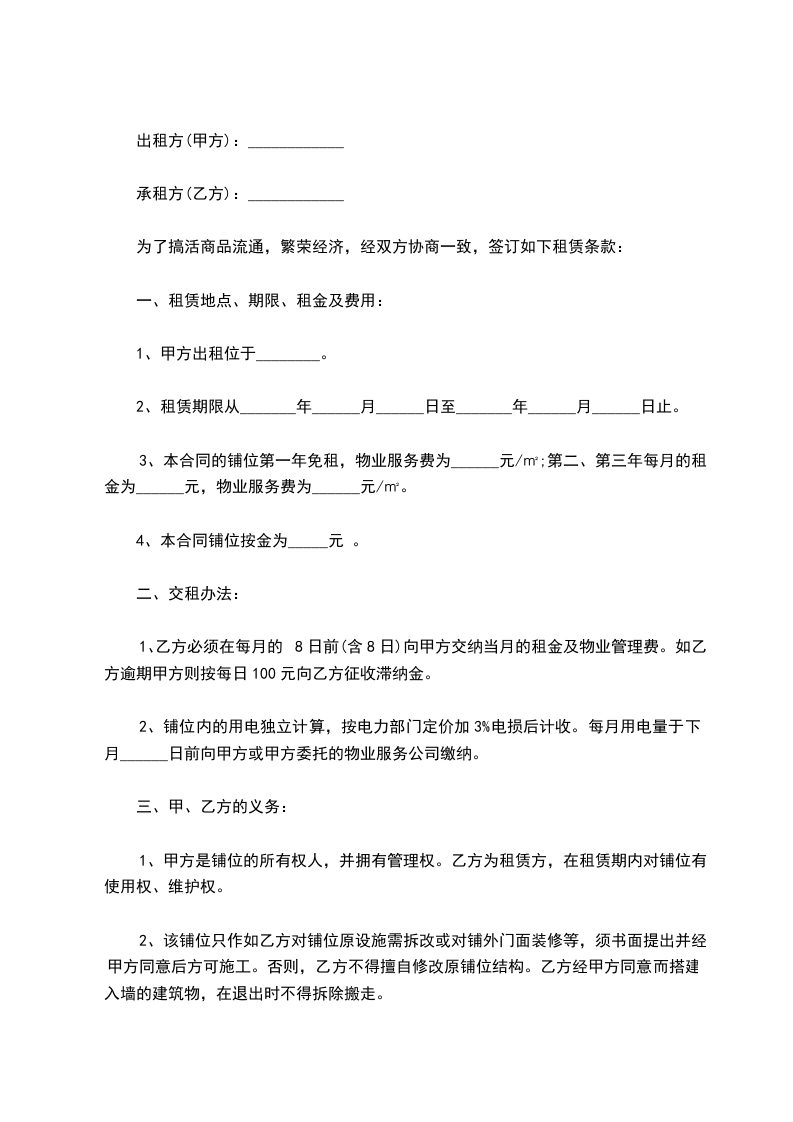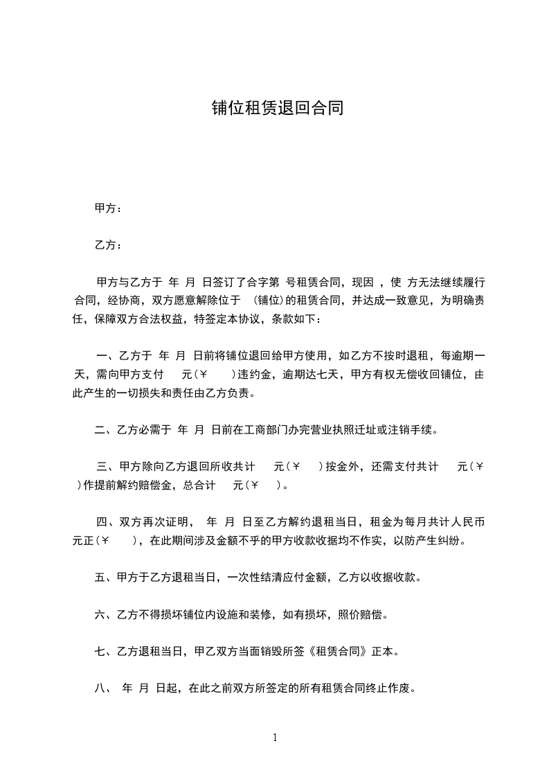 一、乙方于________年____月____日前将铺位退回给甲方使用,如乙方不按时退租,每逾期一天,需向甲方支付_________元(_________)违约金,逾期达七天,甲方有权无偿收回铺位,由此产生的一切损失和责任由乙方负责。