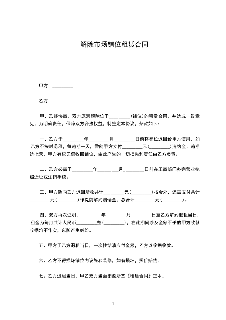 经协商,双方愿意解除位于_________(铺位)的租赁合同,并达成一致意见,为明确责任,保障双方合法权益,特签定本协议,条款如下: