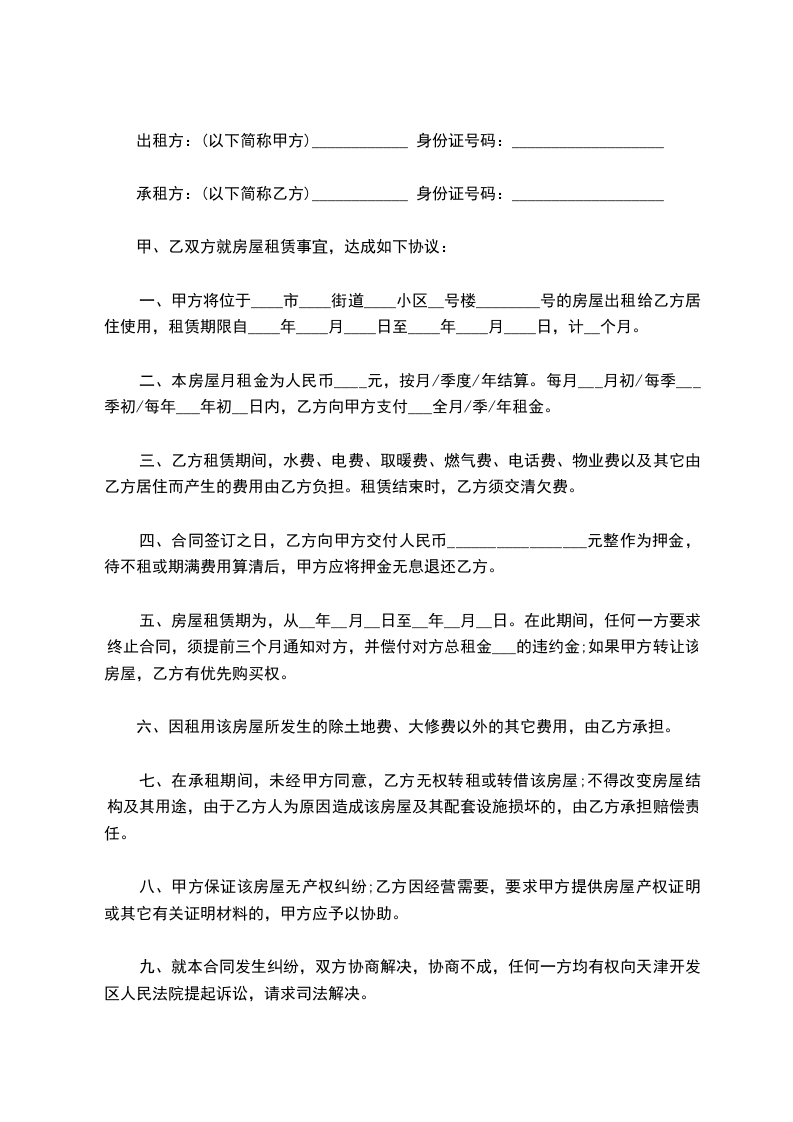 一、甲方将位于____市____街道____小区__号楼________号的房屋出租给乙方居住使用,租赁期限自____年____月____日至____年____月____日,计__个月。