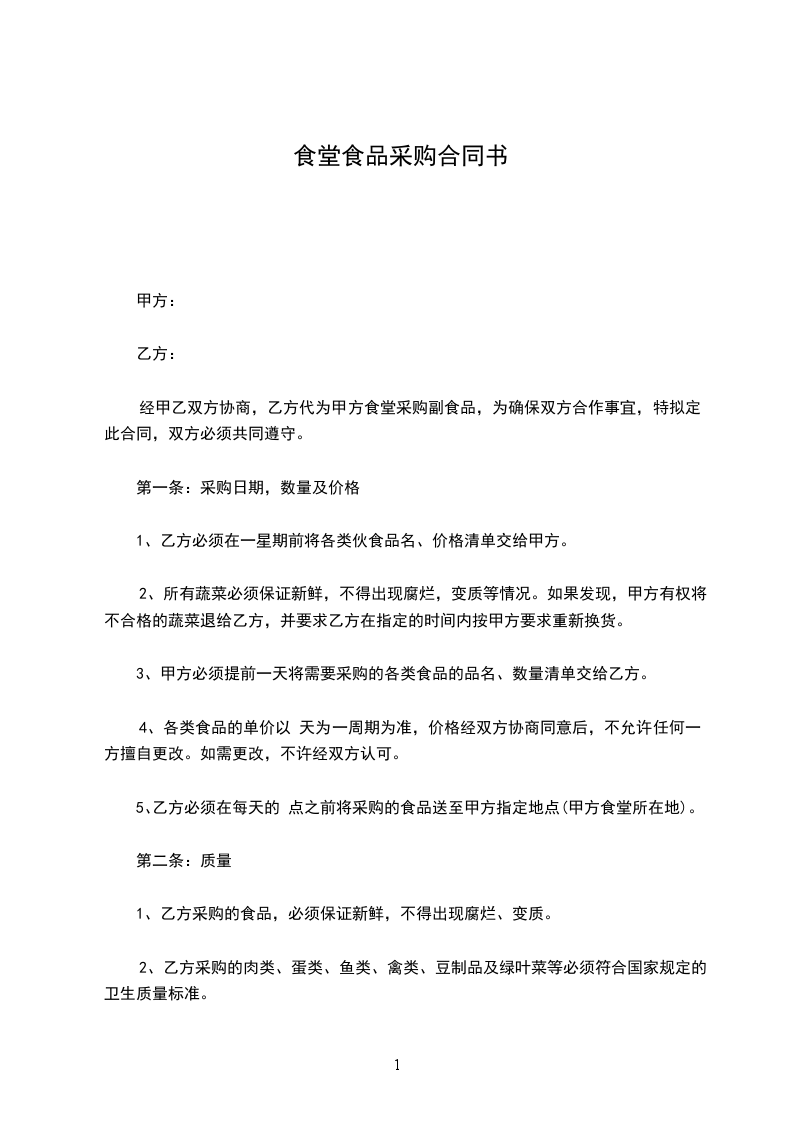 经甲乙双方协商,乙方代为甲方食堂采购副食品,为确保双方合作事宜,特拟定此合同,双方必须共同遵守。