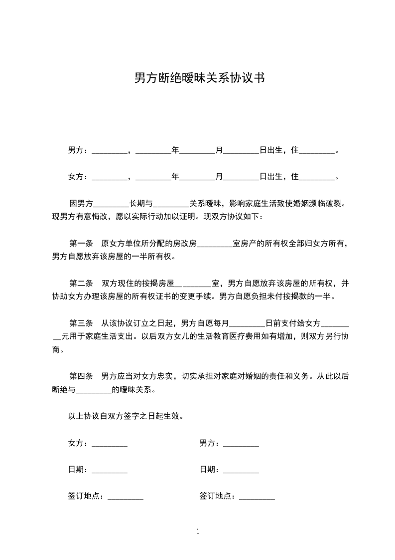 第四条 男方应当对女方忠实,切实承担对家庭对婚姻的责任和义务。从此以后断绝与_________的暧昧关系。