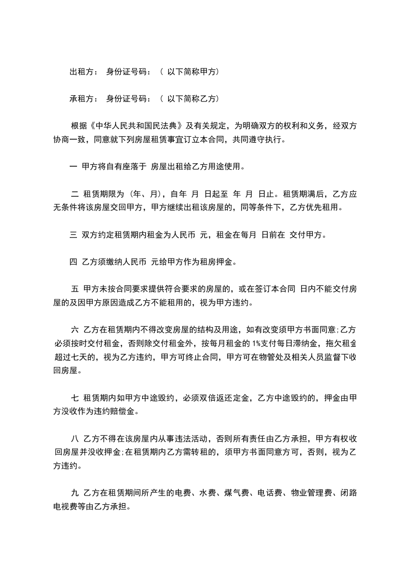 承租方: 身份证号码: ( 以下简称乙方)