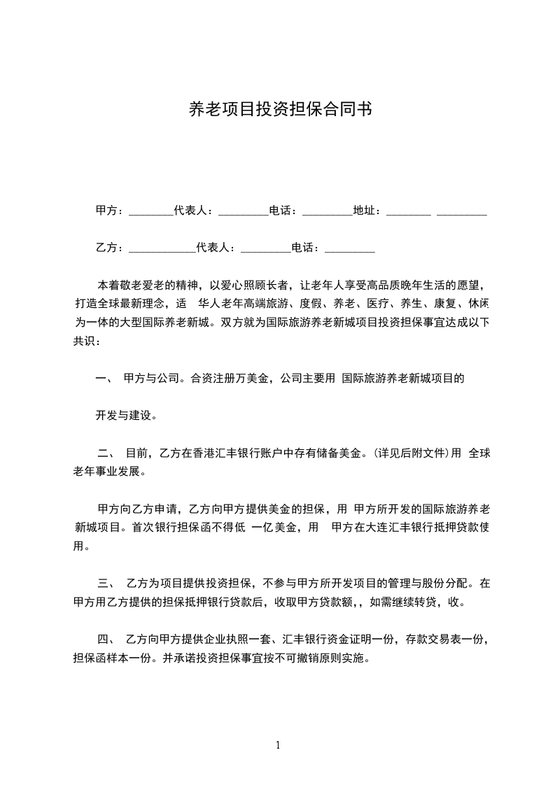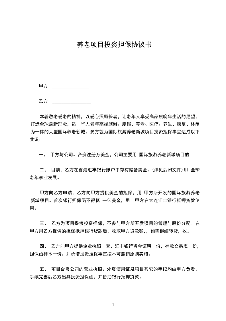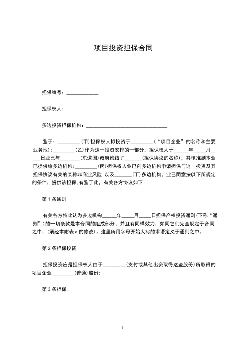 鉴于:_________(甲)担保权人拟投资于_________(“项目企业”的名称和主要业务地);_________(乙)作为这一投资安排的一部分,担保权人于______年_____月_____日业已与________(东道国)政府缔结了_______(担保协议的名称),其核准副本业已提供给多边机构;_________(丙)担保权人业已向多边机构申请担保与这一投资及其担保协议有关的某种非商业风险;以及_______(丁)多边机构,业已同意按以下所规定的条件,提供该担保;有鉴于此,有关各方协议如下: