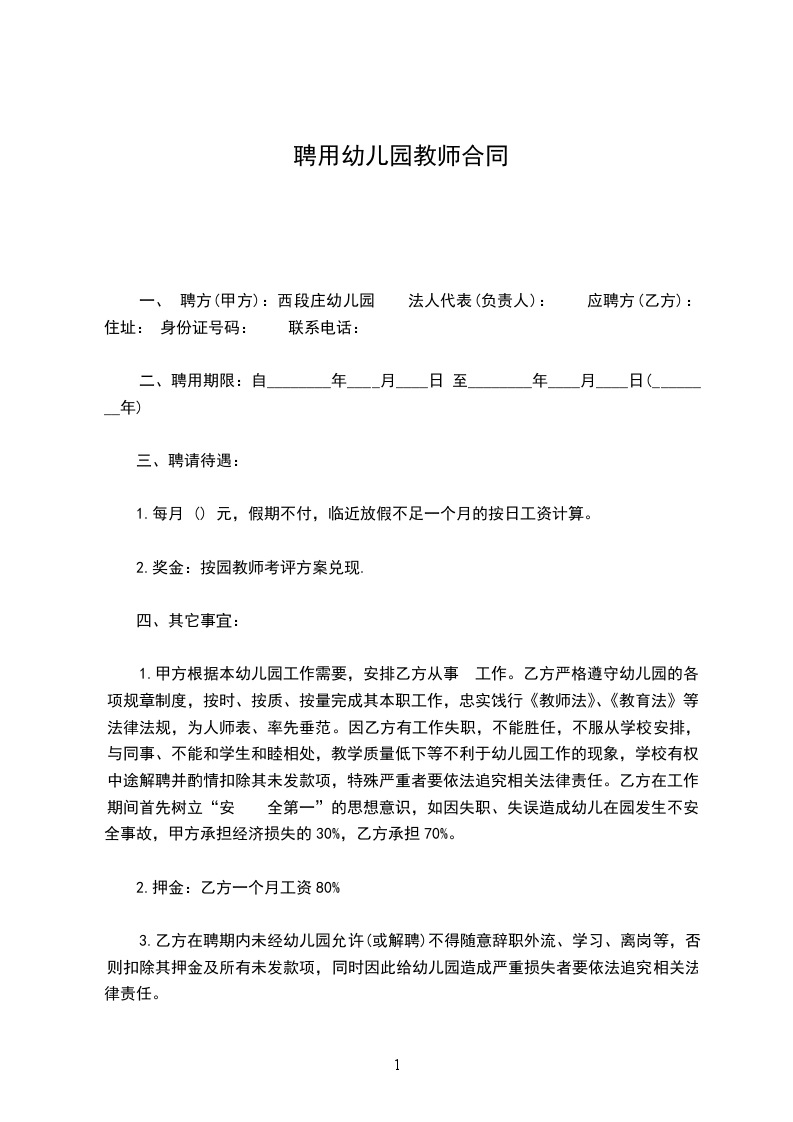 聘用单位:幼儿园 受聘人员: 号码: 幼儿园因工作需要,聘用 为本园幼儿教师,担任教育教学工作。根据国家有关法律、法规、政策规定,双方经平等自愿、协商一致签订本合同如下: