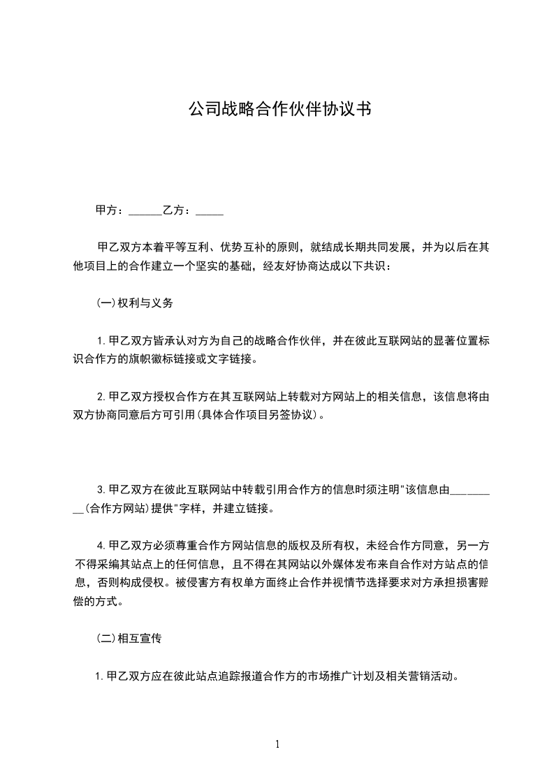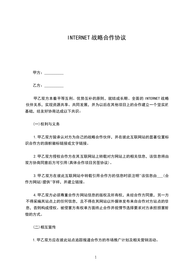 甲乙双方本着平等互利、优势互补的原则,就结成长期、全面的INTERNET战略伙伴关系,实现资源共享、共同发展,并为以后在其他项目上的合作建立一个坚实的基础,经友好协商达成以下共识:
