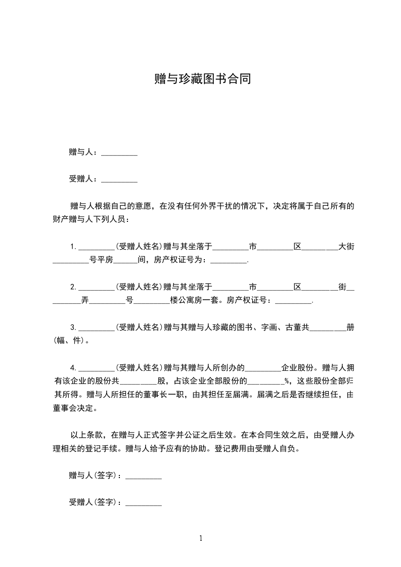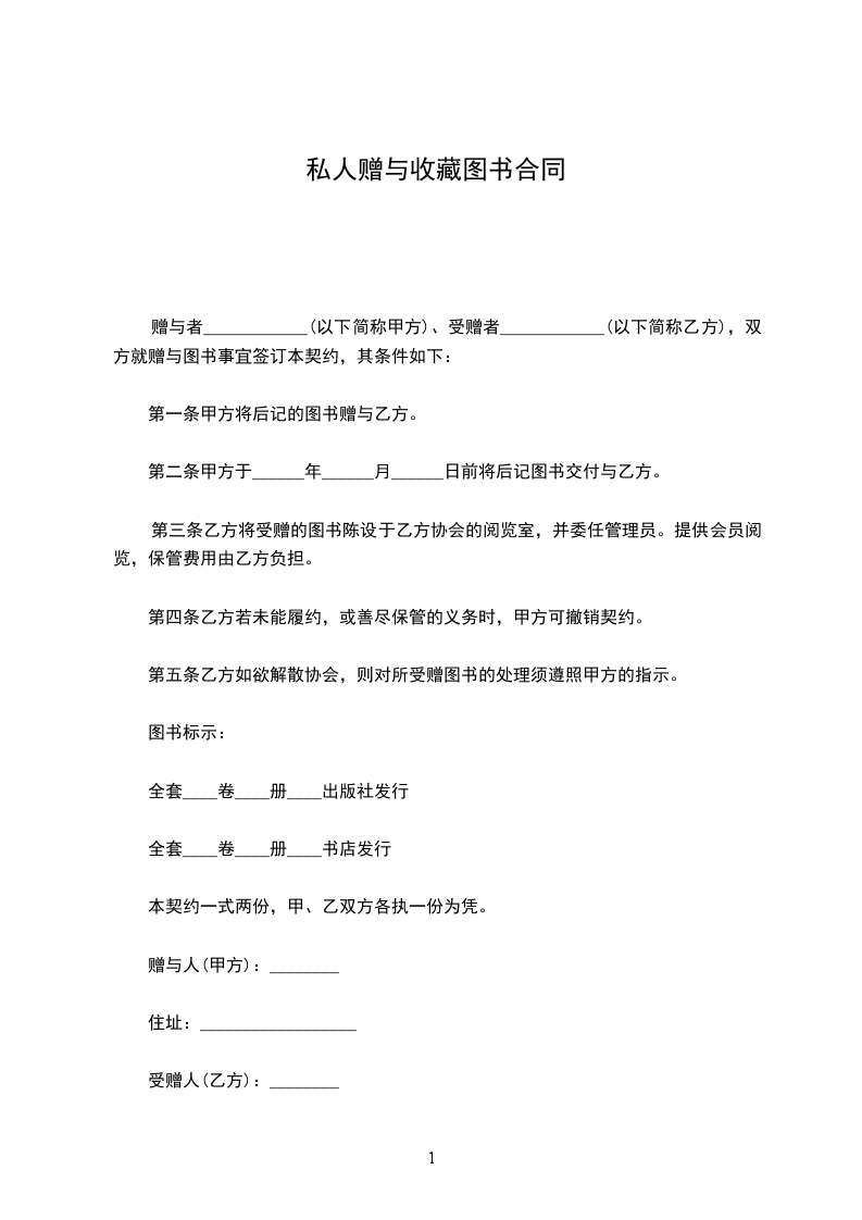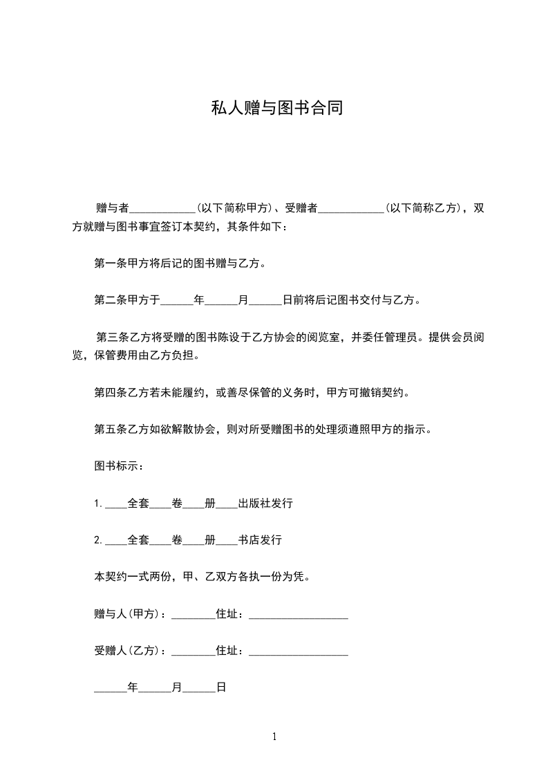 赠与者____________(以下简称甲方)、受赠者____________(以下简称乙方),双方就赠与图书事宜签订本契约,其条件如下: