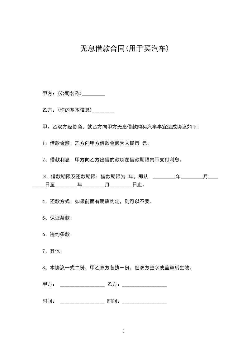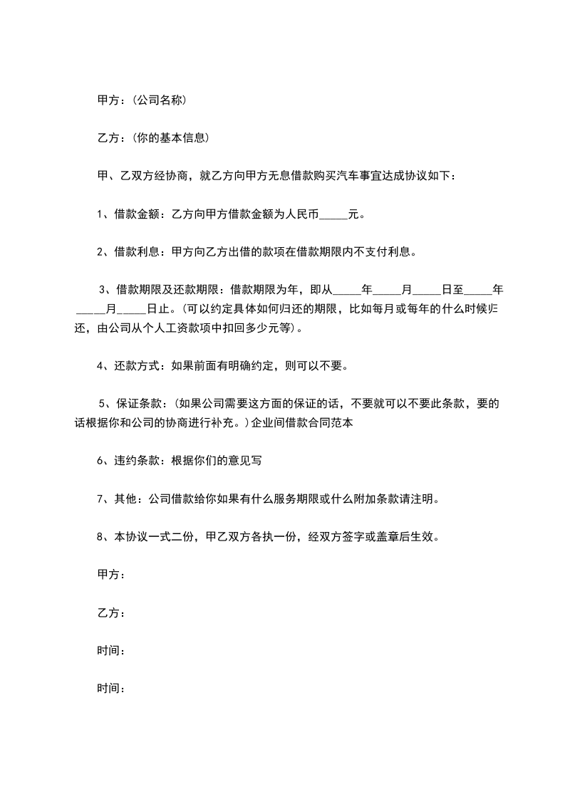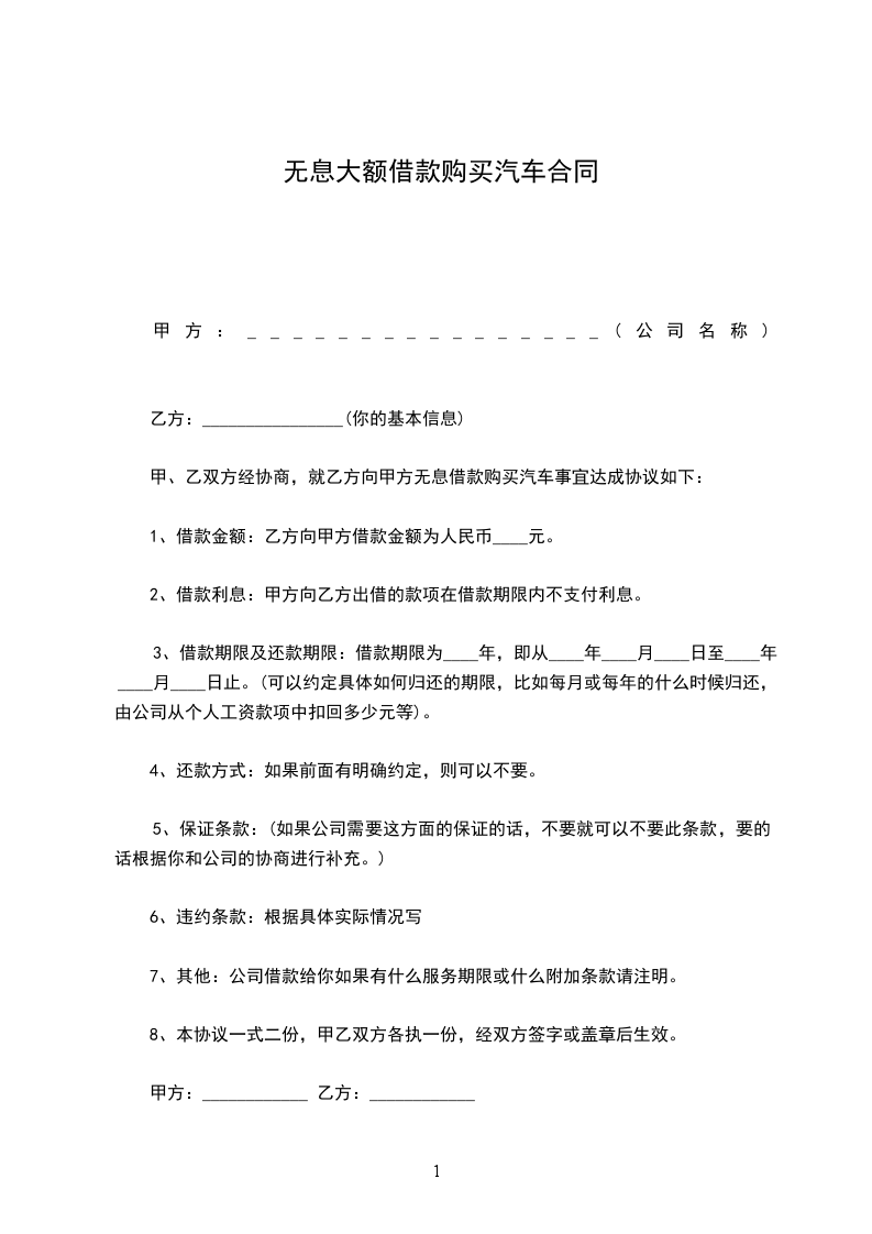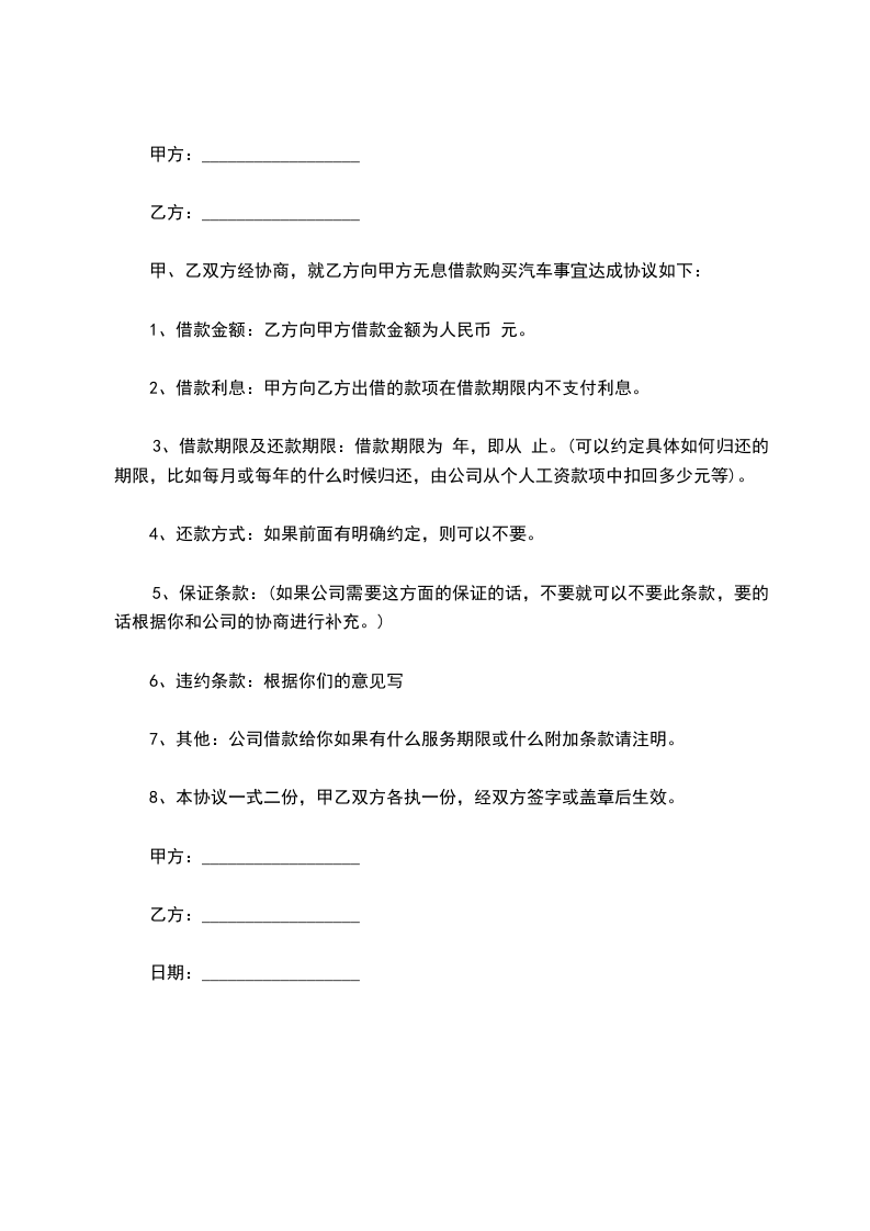 甲、乙双方经协商,就乙方向甲方无息借款购买汽车事宜达成协议如下: