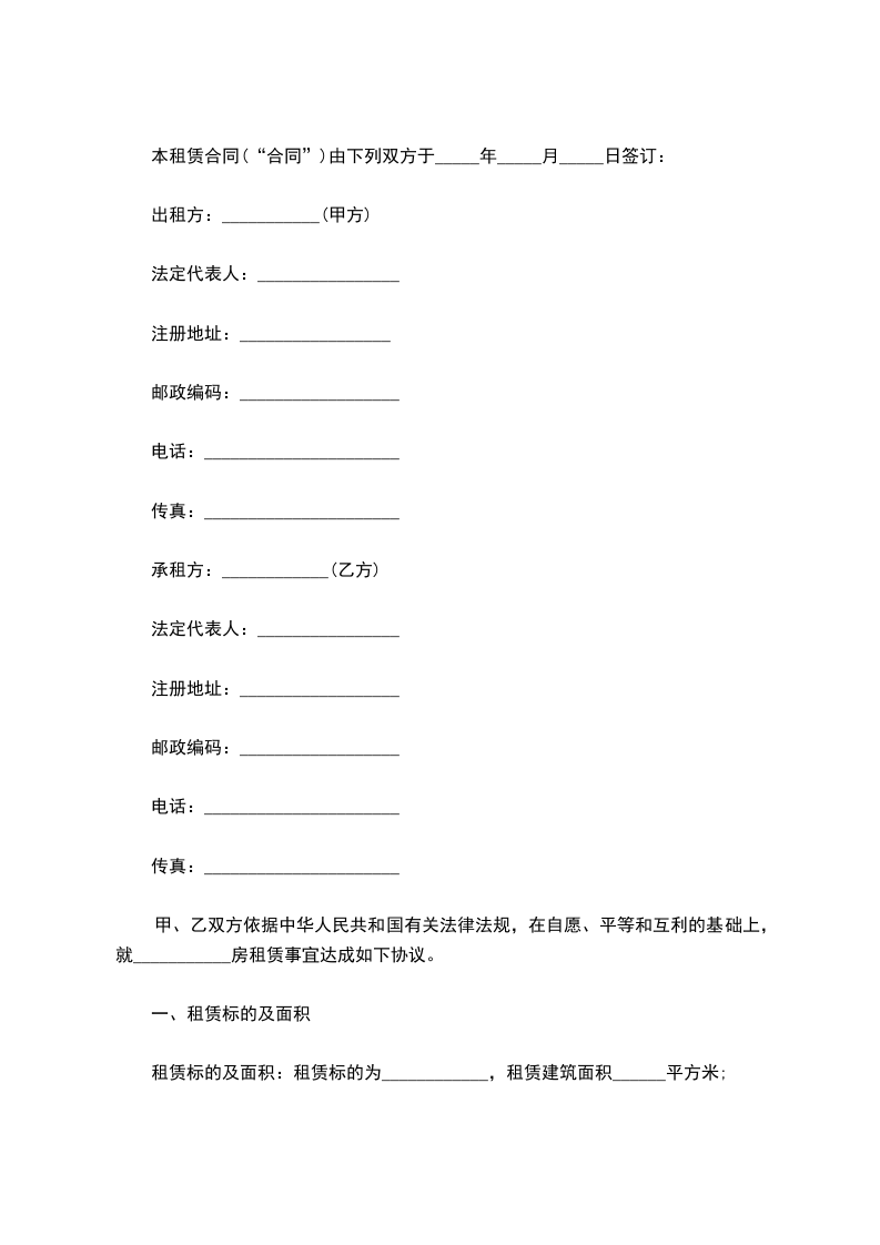 甲、乙双方依据中华人民共和国有关法律法规,在自愿、平等和互利的基础上,就___________房租赁事宜达成如下协议。
