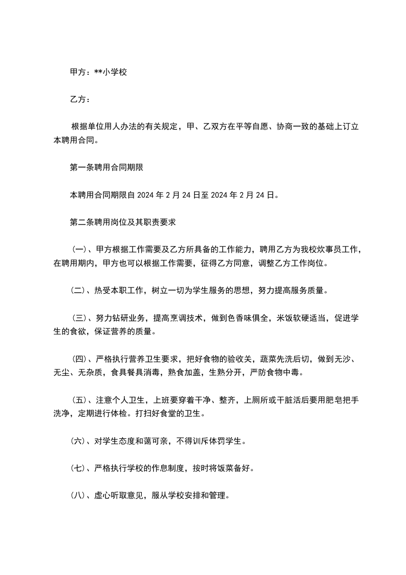 (一)、甲方根据工作需要及乙方所具备的工作能力,聘用乙方为我校炊事员工作,在聘用期内,甲方也可以根据工作需要,征得乙方同意,调整乙方工作岗位。