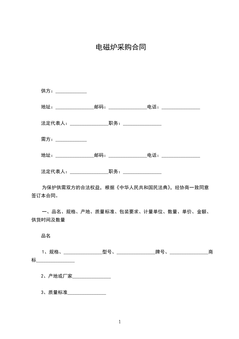 一、品名、规格、产地、质量标准、包装要求、计量单位、数量、单价、金额、供货时间及数量