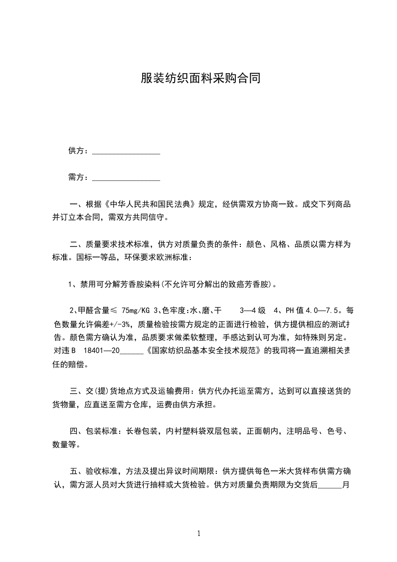 2、甲醛含量≤75mg/KG 3、色牢度:水、磨、干3—4级 4、PH值4.0—7.5。每色数量允许偏差+/-3%,质量检验按需方规定的正面进行检验,供方提供相应的测试报告。颜色需方确认为准,品质要求做柔软整理,手感达到认可为准,如特殊则另定。对违B 18401—20______《国家纺织品基本安全技术规范》的我司将一直追溯相关责任的赔偿。