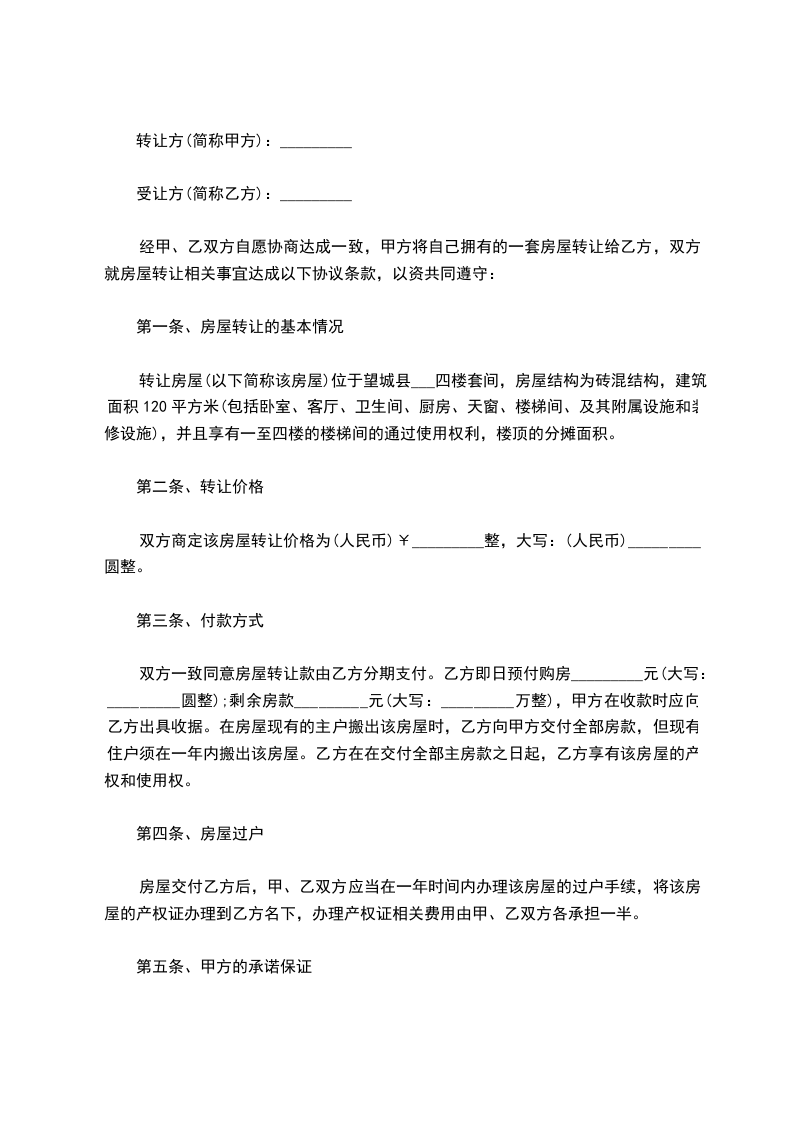 经甲、乙双方自愿协商达成一致,甲方将自己拥有的一套房屋转让给乙方,双方就房屋转让相关事宜达成以下协议条款,以资共同遵守: