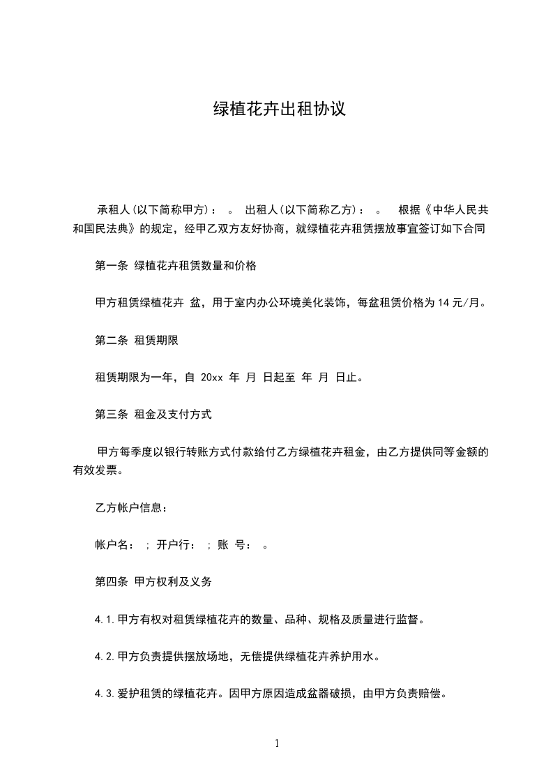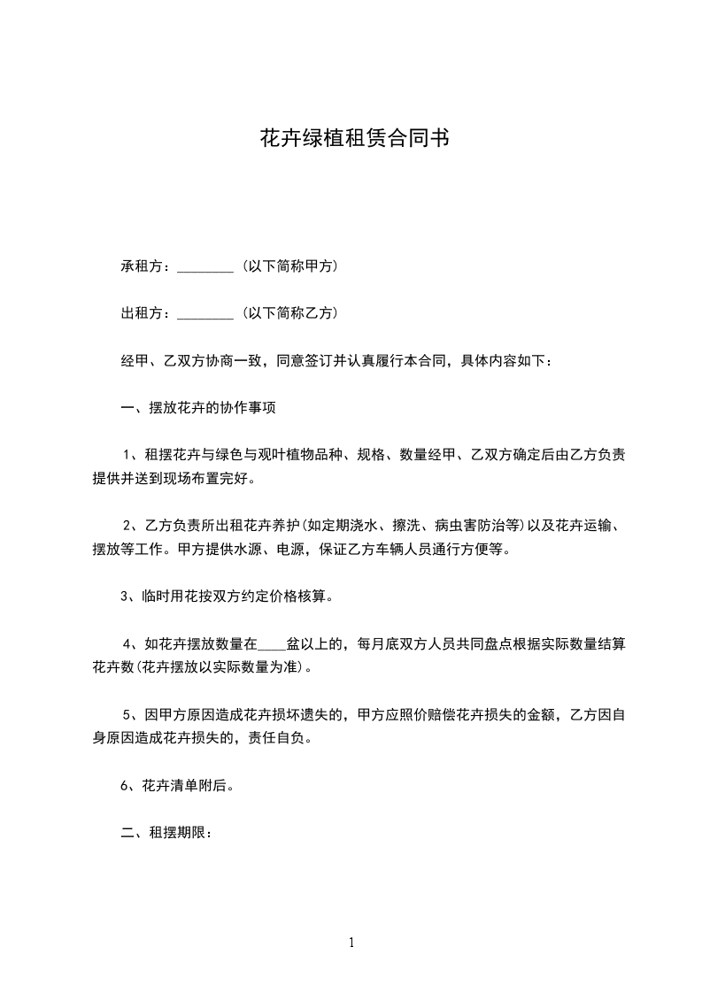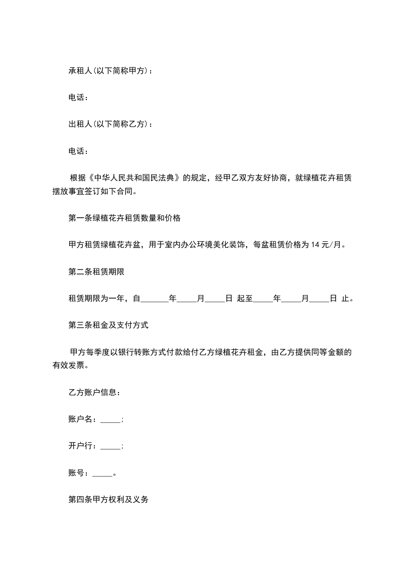 承租人(以下简称甲方): 。 出租人(以下简称乙方): 。 根据《中华人民共和国民法典》的规定,经甲乙双方友好协商,就绿植花卉租赁摆放事宜签订如下合同。