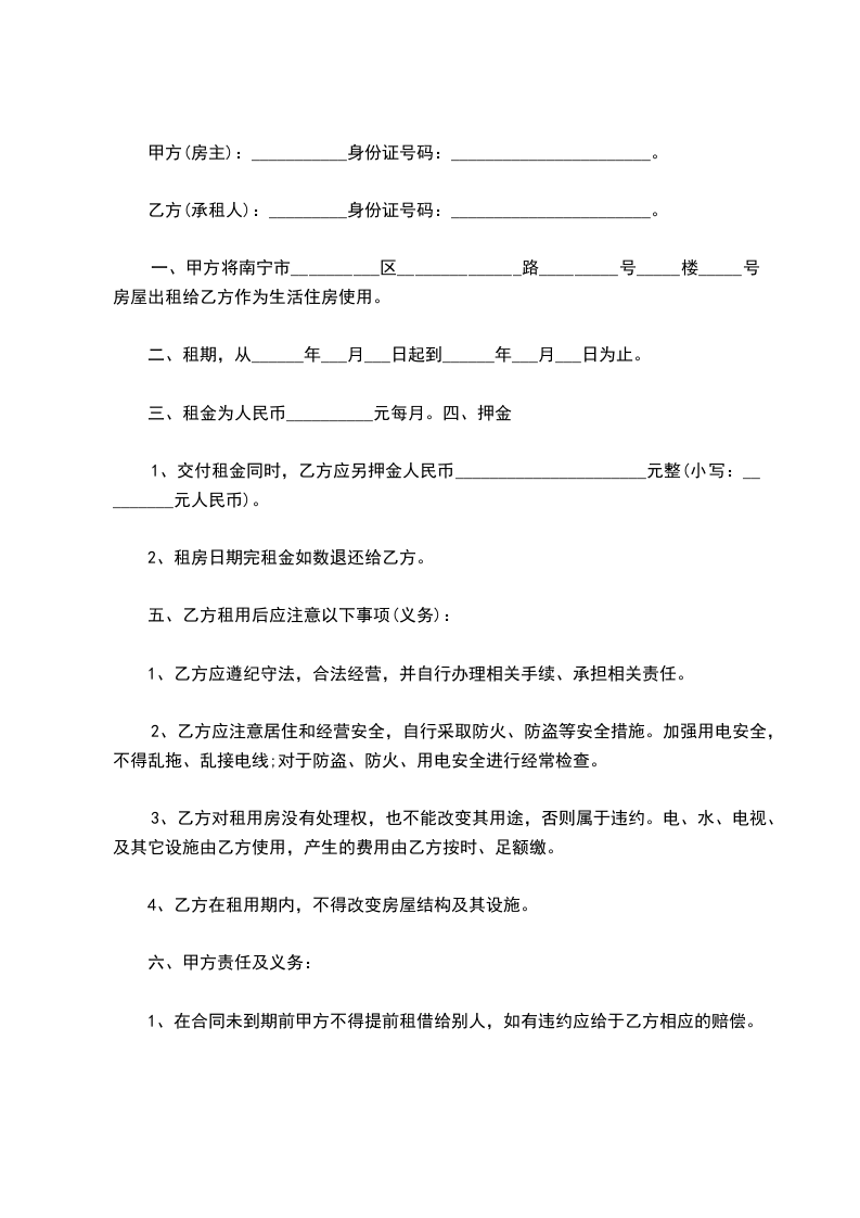 一、甲方将南宁市__________区______________路_________号_____楼_____号房屋出租给乙方作为生活住房使用。