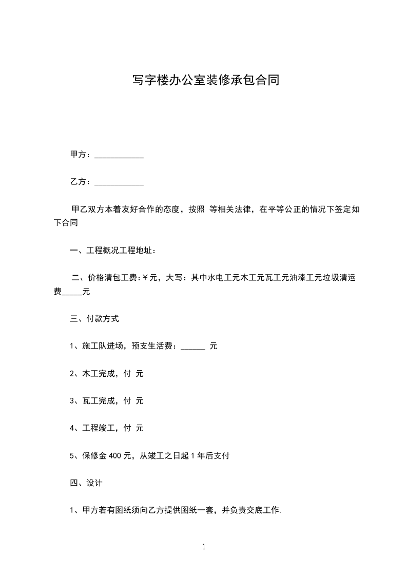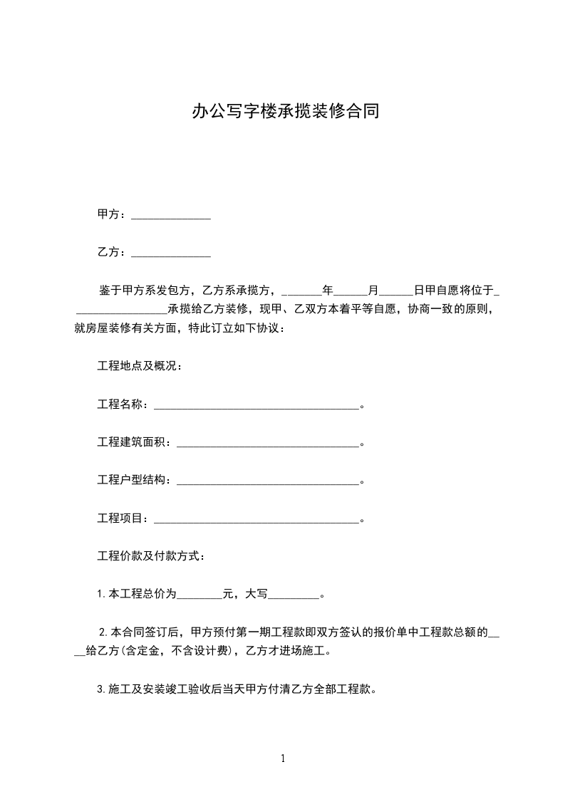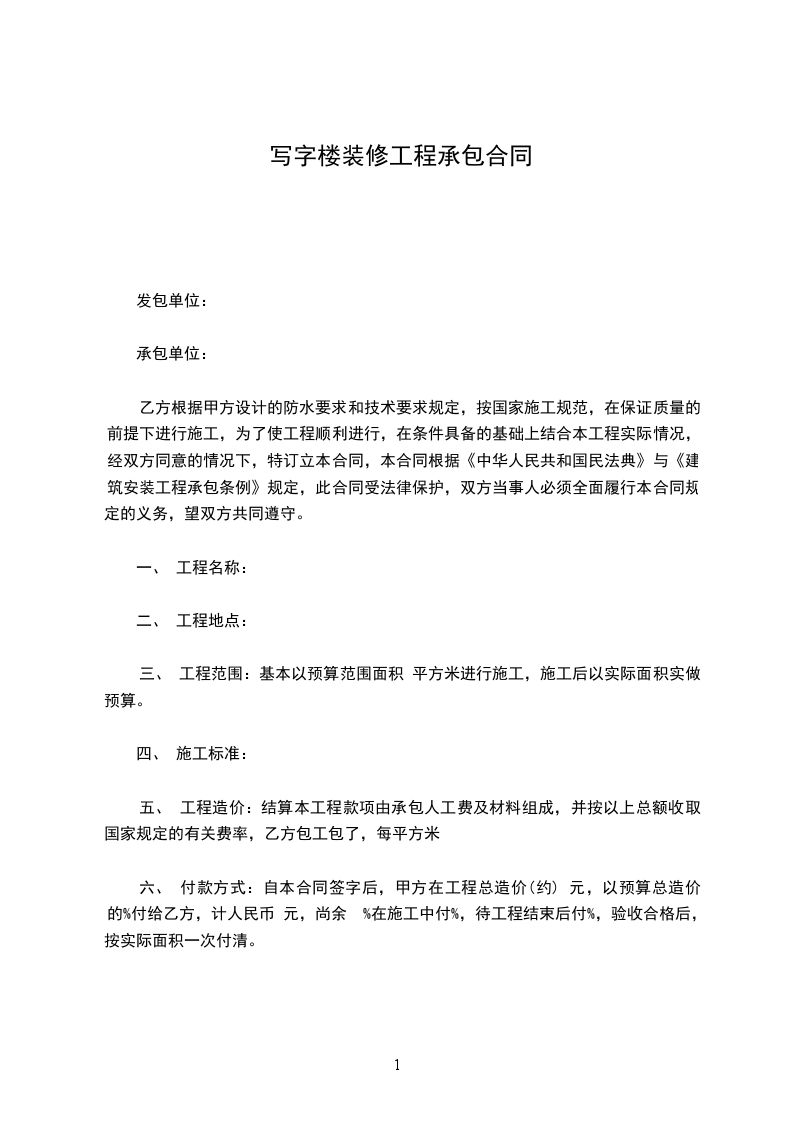 六、 付款方式:自本合同签字后,甲方在工程总造价(约) 元,以预算总造价的 %付给乙方,计人民币 元,尚余 %在施工中付%,待工程结束后付%,验收合格后,按实际面积一次付清。