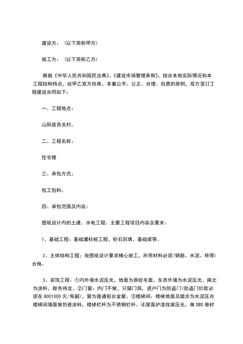 五、 工程造价:结算本工程款项由承包人工费及材料组成,并按以上总额收取国家规定的有关费率,乙方包工包了,每平方米