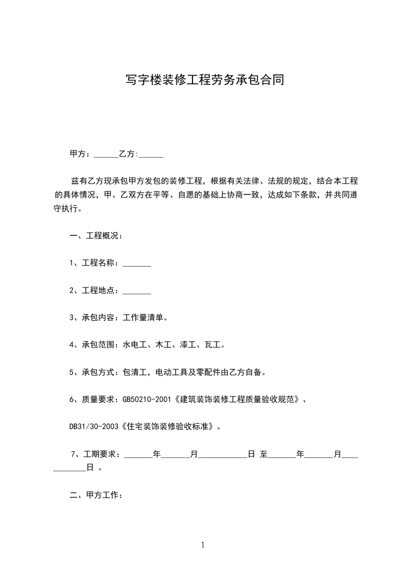 八、 安全条例:乙方施工人员应遵守甲方的有关规章制度和治安条 例,但甲方必须交代清楚,乙方在施工过程如发生疾病、工伤、由乙方自理,甲方应发扬人道主义精神,协助乙方抢救工作。