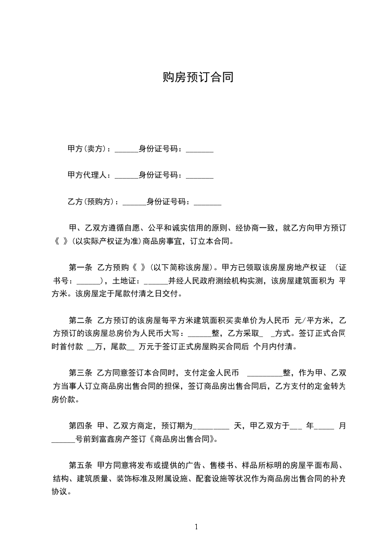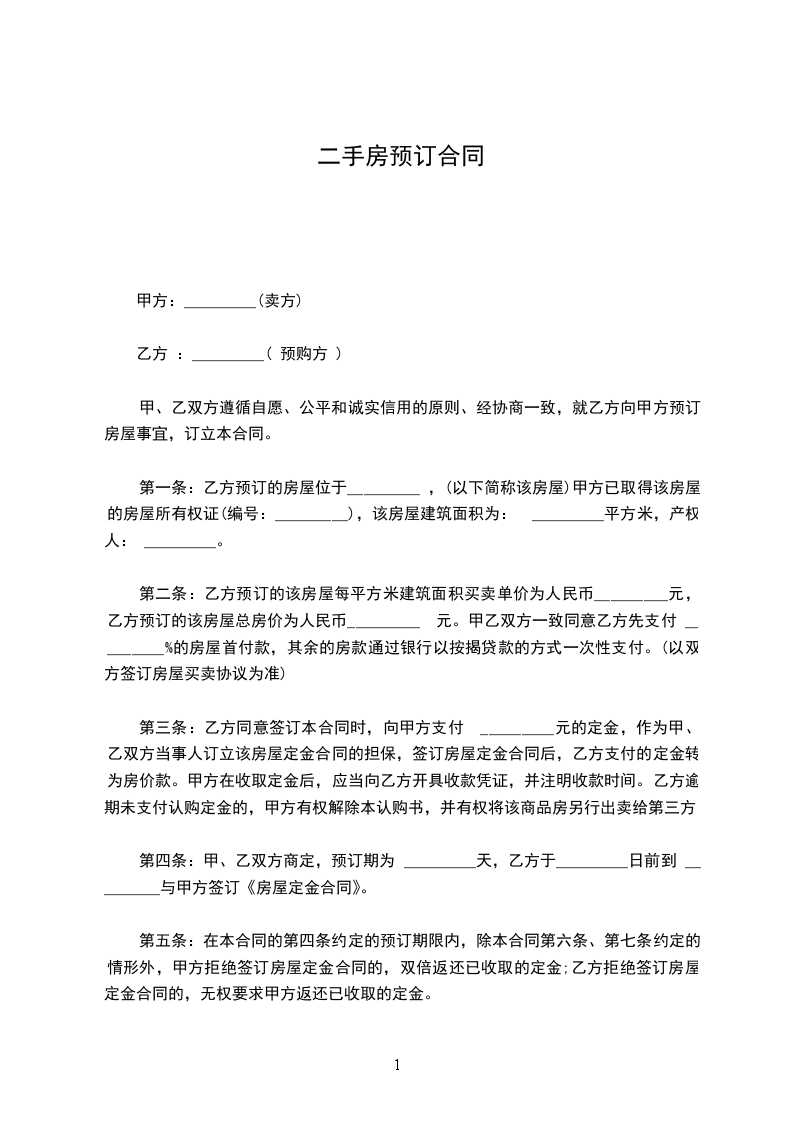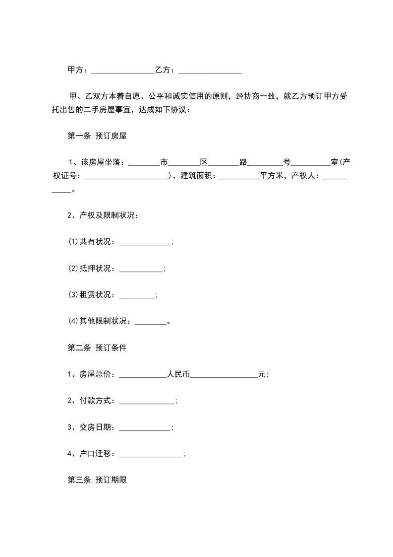 第四条:甲、乙双方商定,预订期为 天,乙方于200 年 月 日前到 与甲方签订《房屋定金合同》。