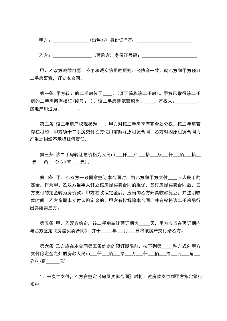 元,乙方预订的该房屋总房价为人民币 元。甲乙双方一致同意乙方先支付 %的房屋首付款,其余的房款通过银行以按揭贷款的方式一次性支付。(以双方签订房屋买卖协议为准)