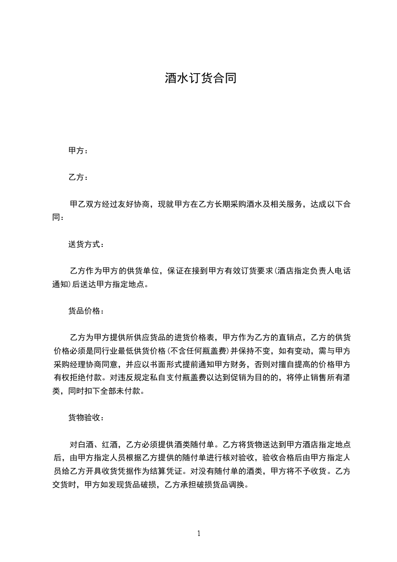 甲乙双方经过友好协商,现就甲方在乙方长期采购酒水及相关服务,达成以下合同: