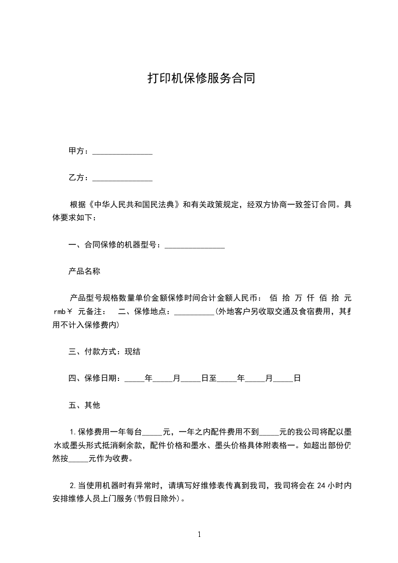 1.保修费用一年每台_____元,一年之内配件费用不到_____元的我公司将配以墨水或墨头形式抵消剩余款,配件价格和墨水、墨头价格具体附表格一。如超出部份仍然按_____元作为收费。