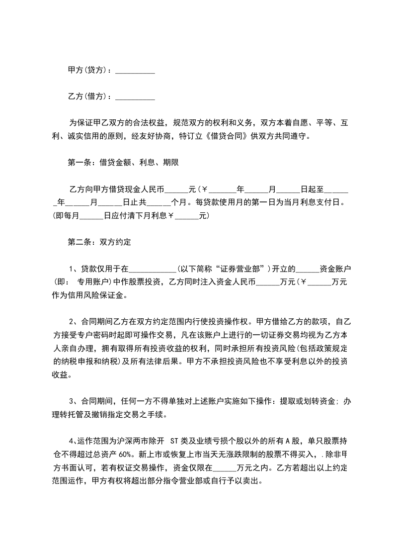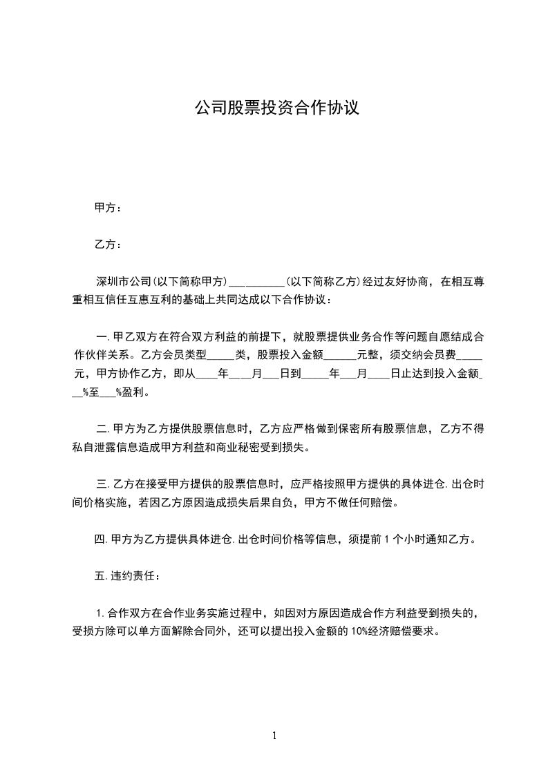 一.甲乙双方在符合双方利益的前提下,就股票提供业务合作等问题自愿结成合作伙伴关系。乙方会员类型_____类,股票投入金额______元整,须交纳会员费_____元,甲方协作乙方,即从____年____月___日到_____年___月____日止达到投入金额___%至___%盈利。
