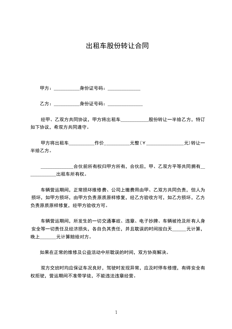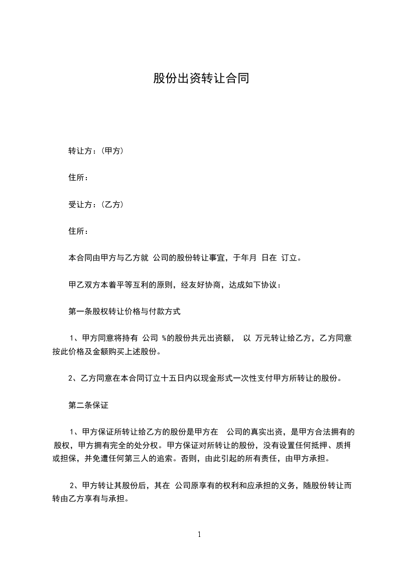 1、甲方同意将持有 公司 %的股份共元出资额, 以 万元转让给乙方,乙方同意按此价格及金额购买上述股份。