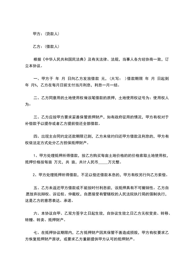 1、甲方处理抵押所得借款,按乙方购买每亩土地价格的的价格索取土地使用权,抵押价格按每亩 万元,共 亩,共计人民币_____万元整。