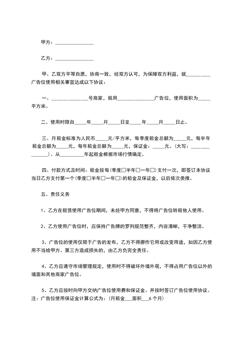 5、乙方应按时向甲方交纳广告位使用费和保证金、并按时签订广告位使用协议。注:广告位使用保证金计算公式为:(月租金___面积___6个月)