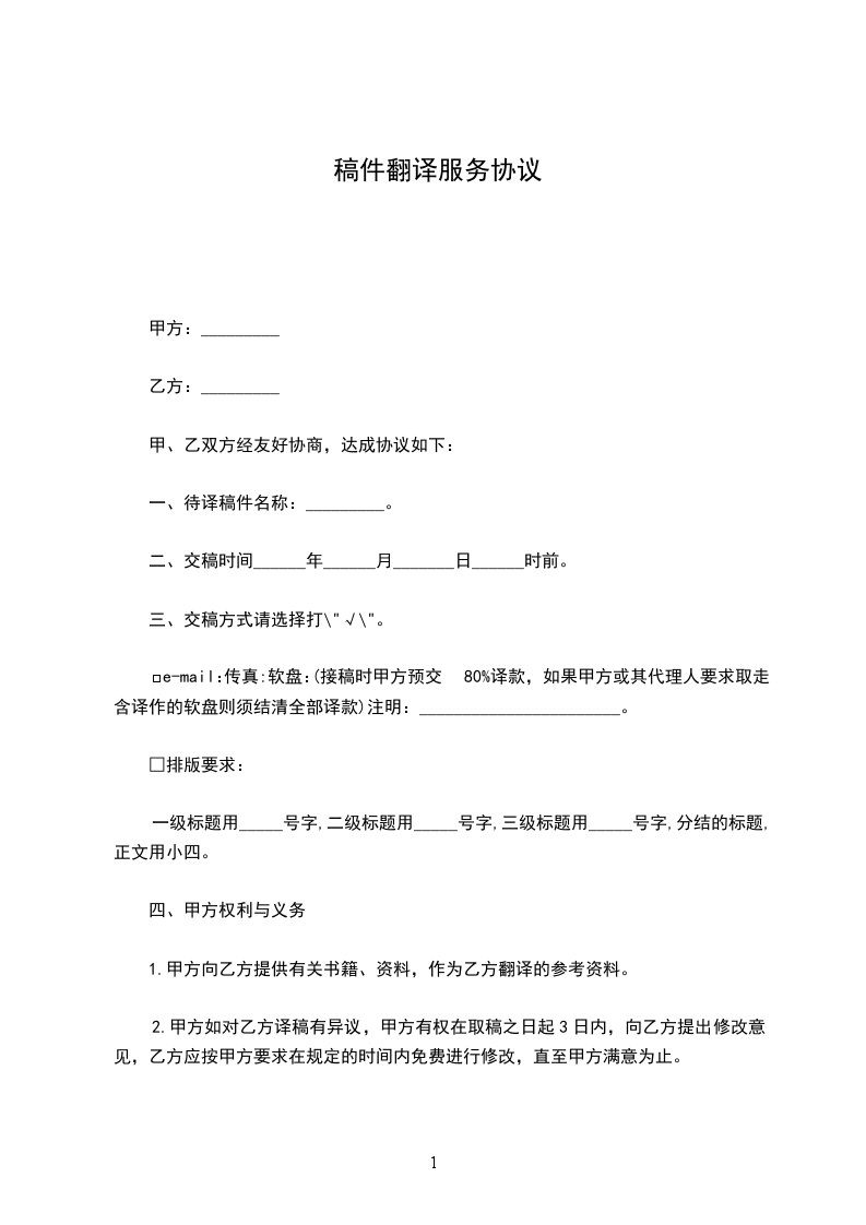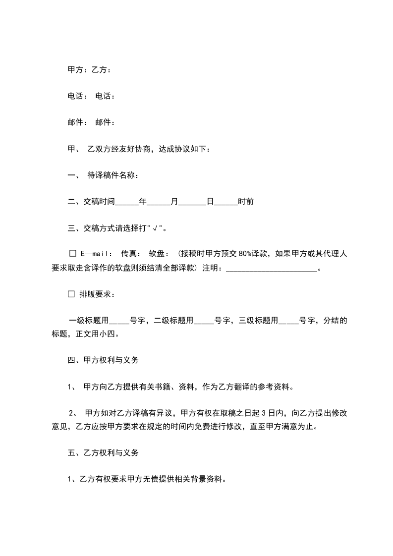 □ E—mail: 传真: 软盘: (接稿时甲方预交80%译款,如果甲方或其代理人要求取走含译作的软盘则须结清全部译款) 注明:_______________________。