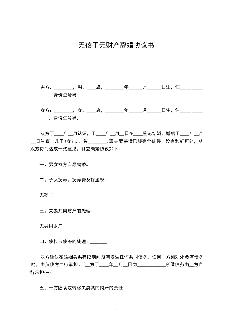 双方于xx年 月 日在 人民政府的民政部门登记结婚,婚后无子女,因双方性格不和,无法共同生活,自愿离婚,经双方协商一致,订立离婚协议如下: