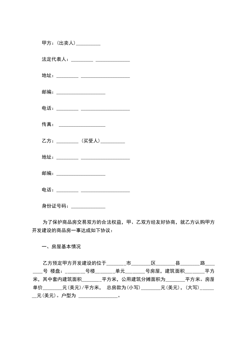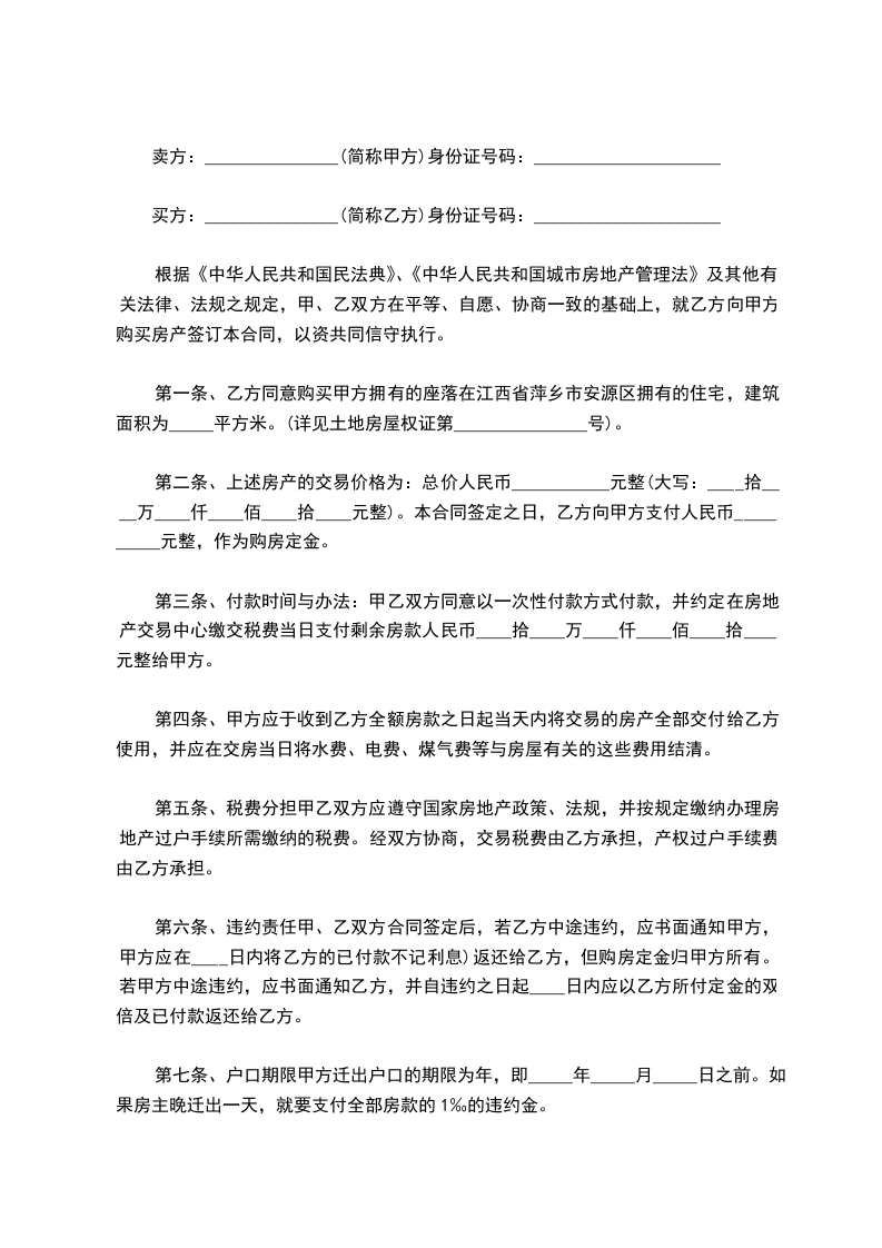 第一条、乙方同意购买甲方拥有的座落在江西省萍乡市安源区拥有的住宅,建筑面积为_____平方米。(详见土地房屋权证第_______________号)。