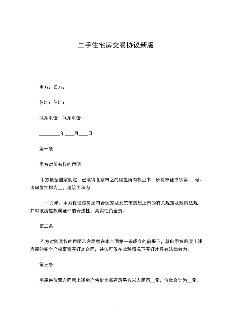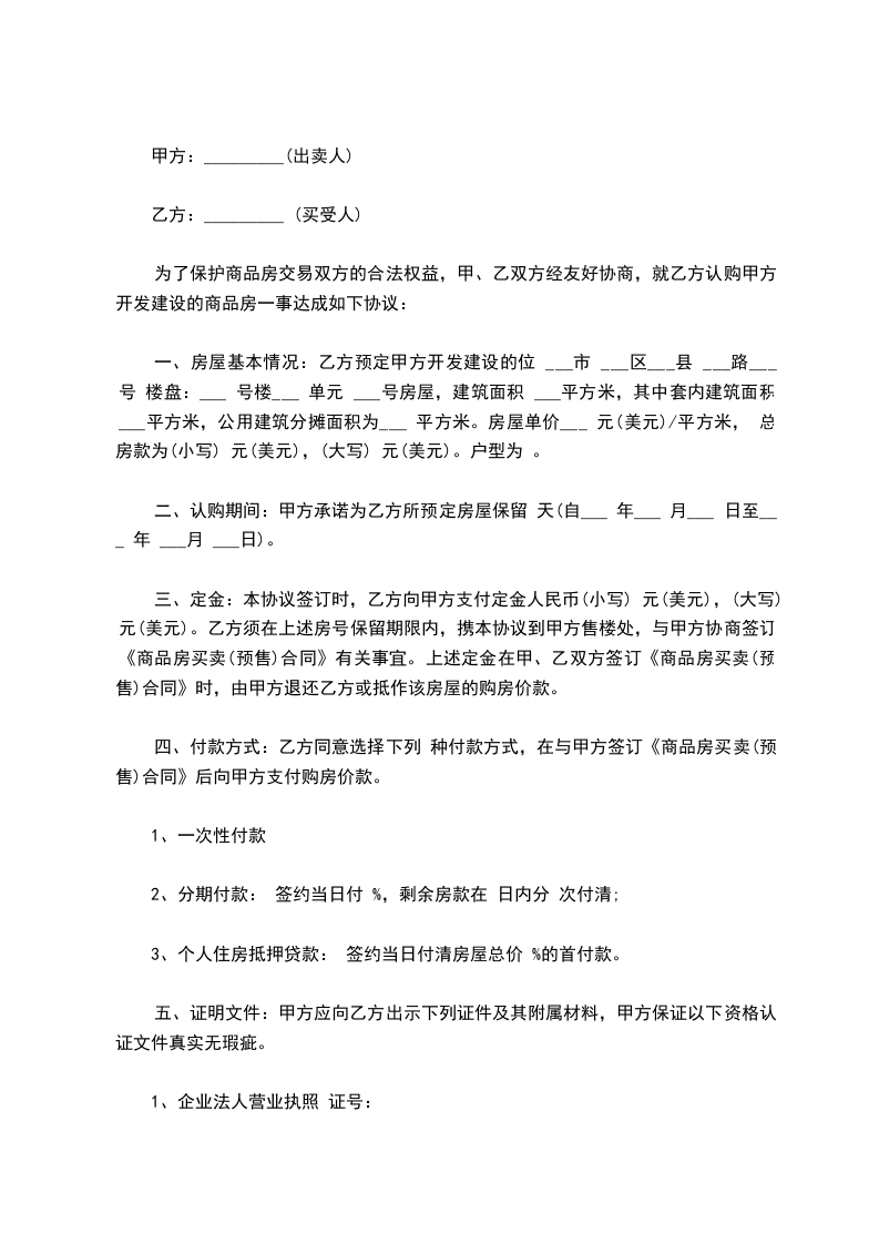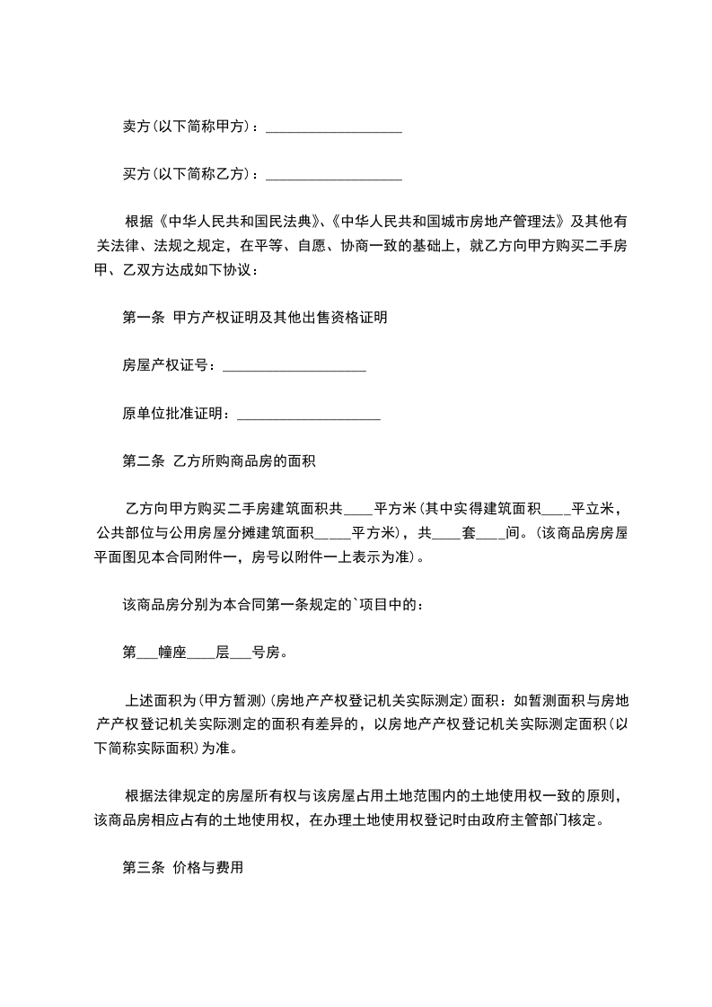 第二条、上述房产的交易价格为:总价人民币___________元整(大写:____拾____万____仟____佰____拾____元整)。本合同签定之日,乙方向甲方支付人民币__________元整,作为购房定金。